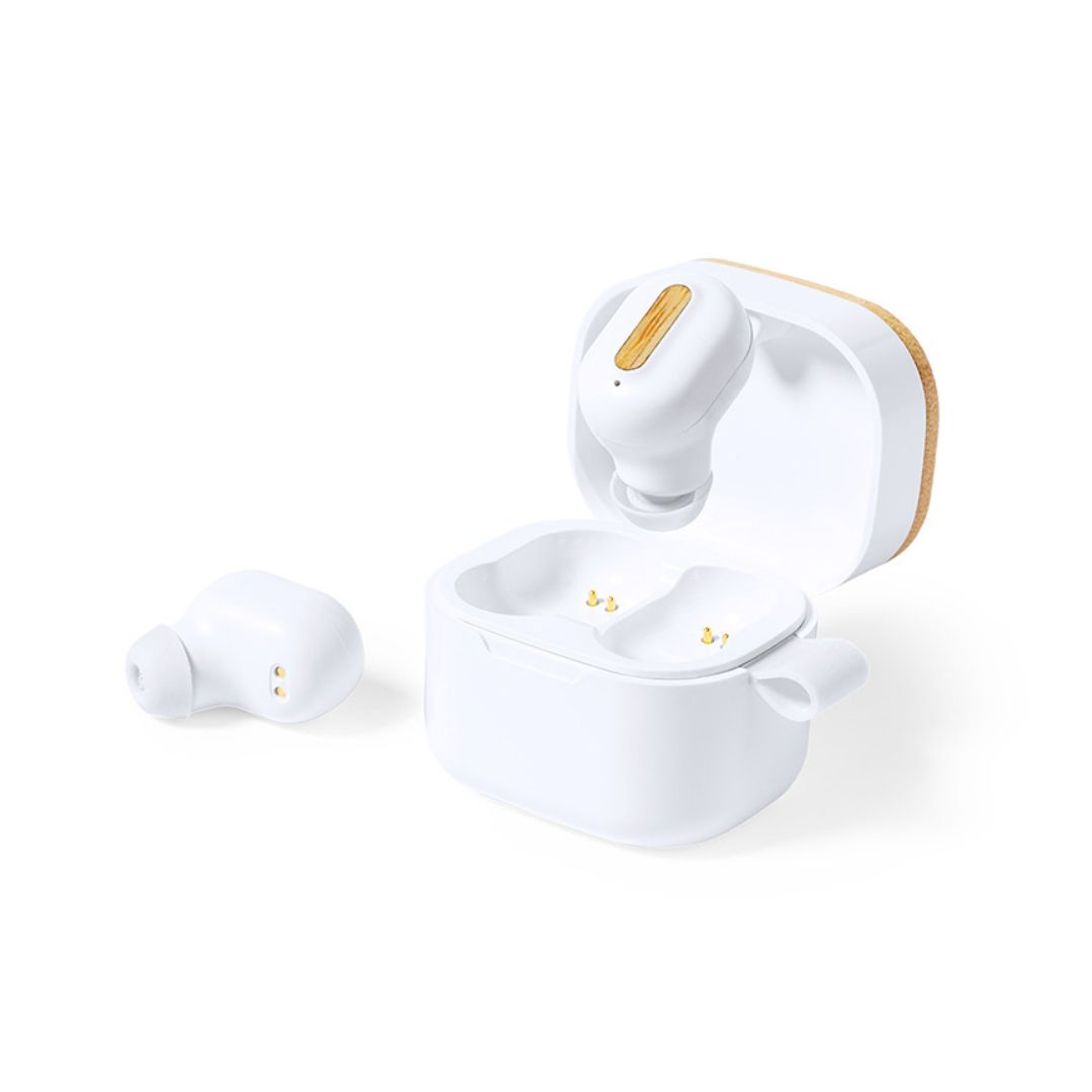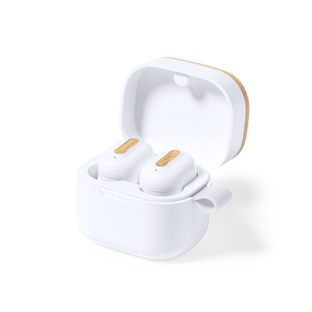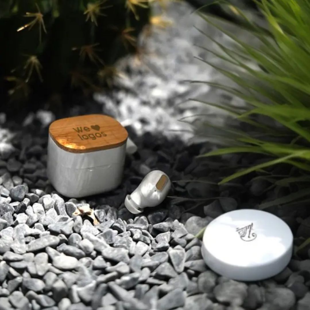 Descripción general del producto: Auriculares inalámbricos fabricados en RABS, bambú y silicona. Cada auricular cuenta con un botón touch que permite contestar y finalizar llamadas, reproducir y pausar música, cambiar a la siguiente o anterior canción. Tienen tecnología Bluetooth 5.3, una duración de batería de aproximadamente 4 horas y un estuche de carga de 300 mAh, el cual se carga a través de un cable usb c. Los auriculares cuentan con almohadillas de diferentes tamaños. Viene dentro de una caja de cartón junto a su manual de instrucciones y cable cargador. ReUseMe.