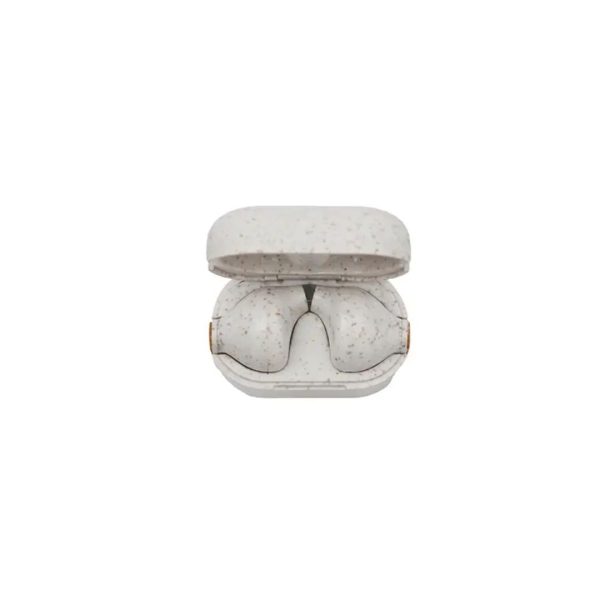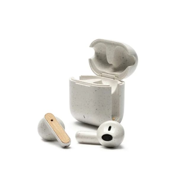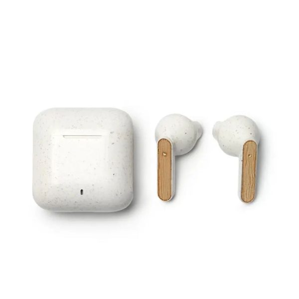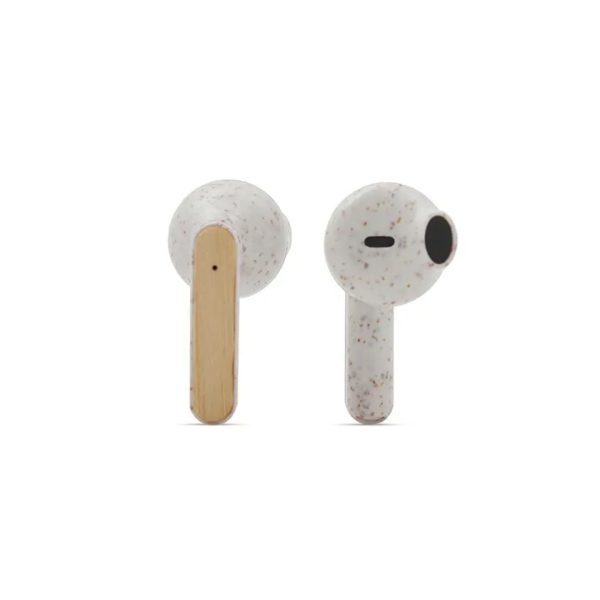 Descripción general del producto: Auriculares inalámbricos fabricados en bambú, ABS y Wheat Straw, pasta de tallo de trigo, un material sustentable que reduce el consumo de plásticos vírgenes. Cada auricular cuenta con un botón touch que permite: contestar y finalizar llamadas, reproducir y pausar música, cambiar a la siguiente o anterior canción, subir y bajar el volumen y acceder al asistente de voz. Tienen tecnología Bluetooth 5.3, una duración de batería de aproximadamente 3.5 horas y un estuche de carga de 200 mAh, el cual se carga a través de un cable usb c. Los auriculares vienen dentro de una caja de cartón junto a su manual de instrucciones y cable cargador. Debido a que la pasta de trigo es un material sustentable y 100% natural, puede haber ligeras variaciones en el color del producto de un lote a otro. ReUseMe.