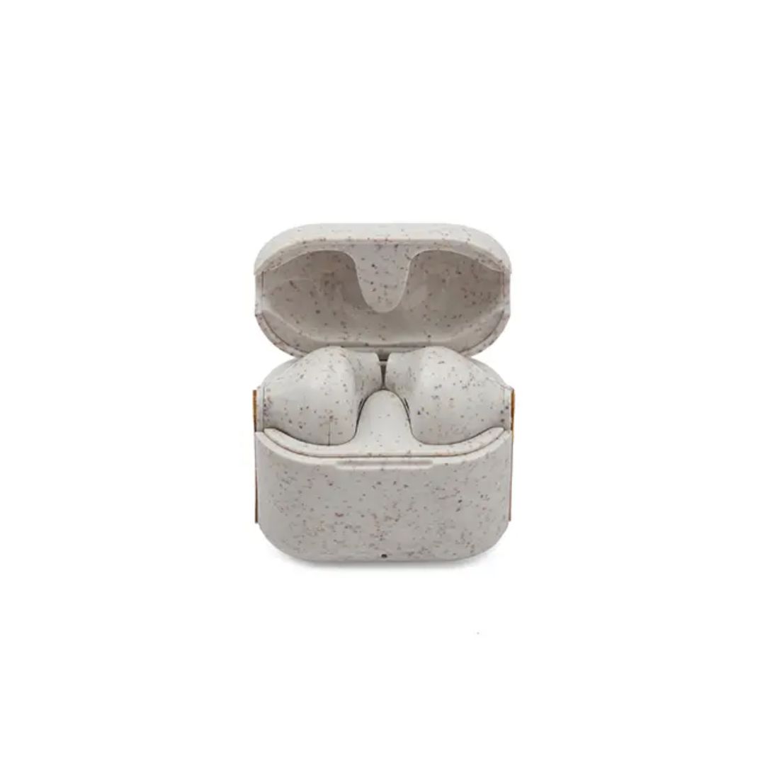 Descripción general del producto: Auriculares inalámbricos fabricados en bambú, ABS y Wheat Straw, pasta de tallo de trigo, un material sustentable que reduce el consumo de plásticos vírgenes. Cada auricular cuenta con un botón touch que permite: contestar y finalizar llamadas, reproducir y pausar música, cambiar a la siguiente o anterior canción, subir y bajar el volumen y acceder al asistente de voz. Tienen tecnología Bluetooth 5.3, una duración de batería de aproximadamente 3.5 horas y un estuche de carga de 200 mAh, el cual se carga a través de un cable usb c. Los auriculares vienen dentro de una caja de cartón junto a su manual de instrucciones y cable cargador. Debido a que la pasta de trigo es un material sustentable y 100% natural, puede haber ligeras variaciones en el color del producto de un lote a otro. ReUseMe.