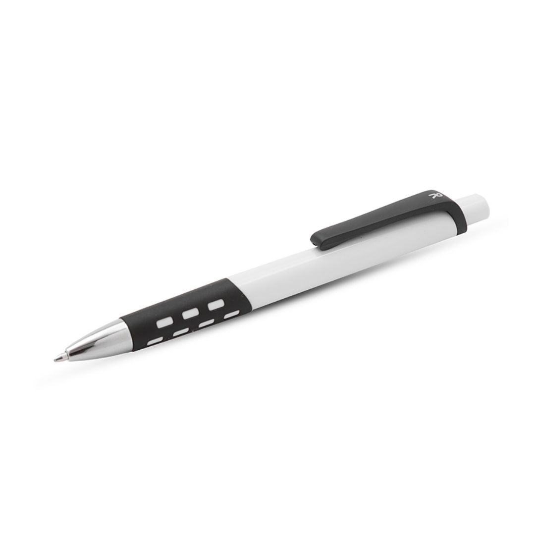 Descripción general del producto: Bolígrafo de plástico, con grip de goma y clip en color negro. Sistema de apertura con pulsador. Tinta negra. Roupen.