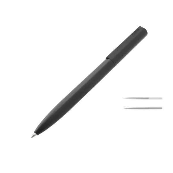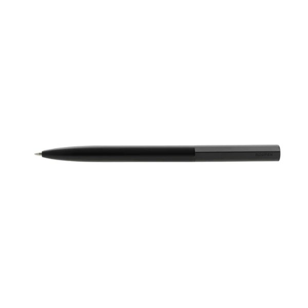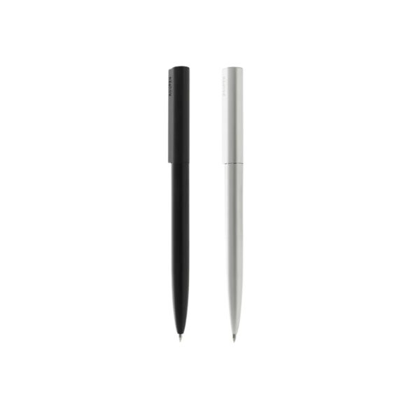 Descripción general del producto: Bolígrafo de cuerpo metálico en aluminio con detalles en negro y plata. Cuenta con tinta azul y apertura con medio giro. Roupen.