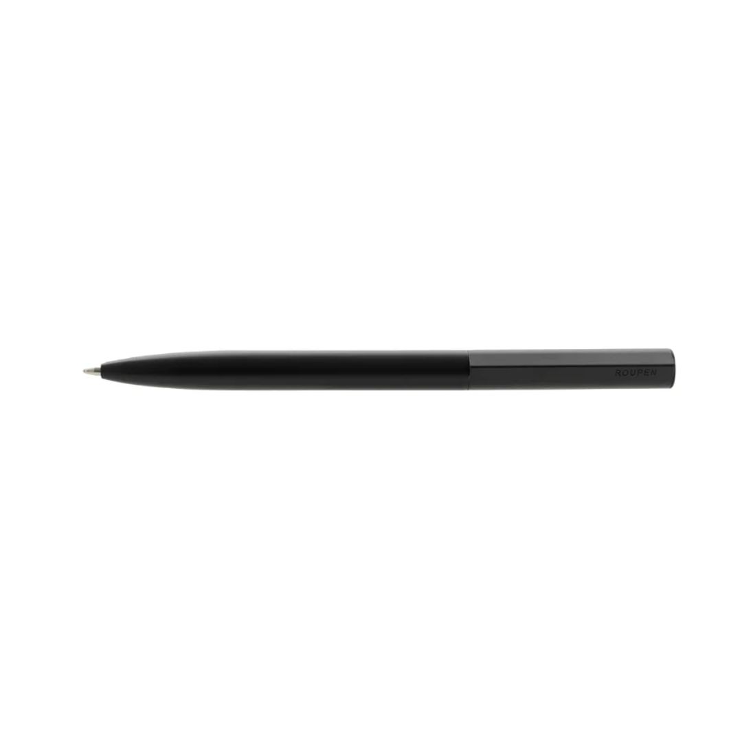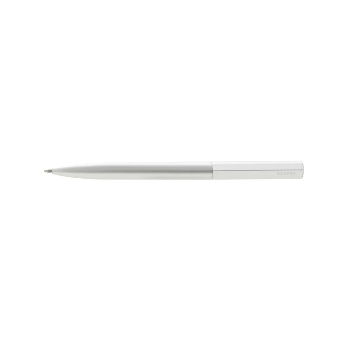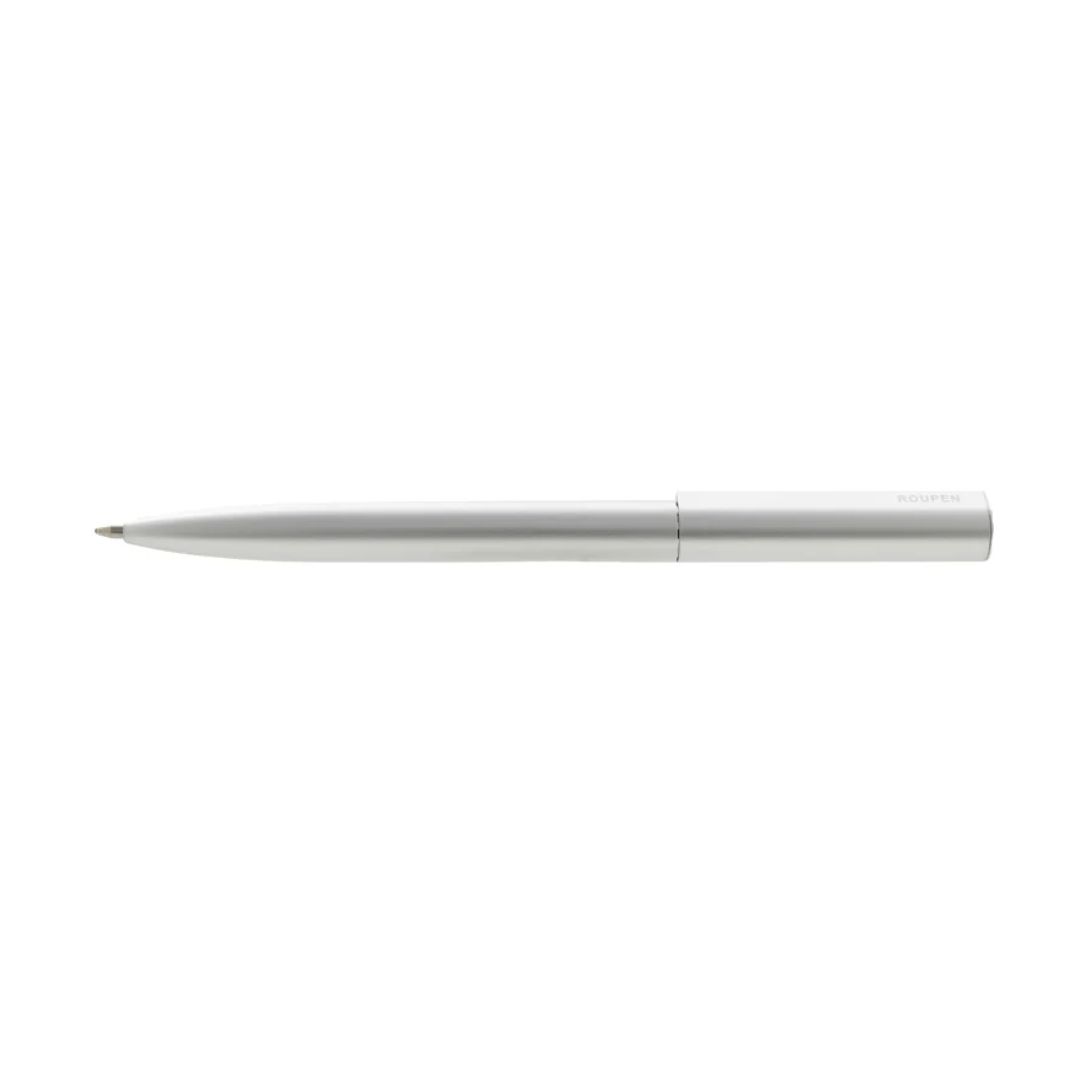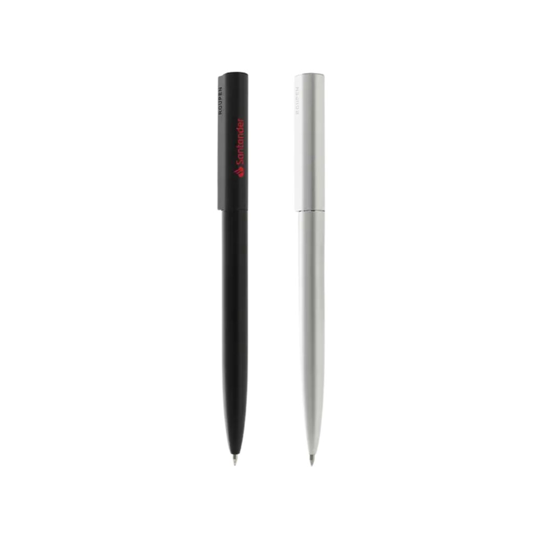 Descripción general del producto: Bolígrafo de cuerpo metálico en aluminio con detalles en negro y plata. Cuenta con tinta azul y apertura con medio giro. Roupen.