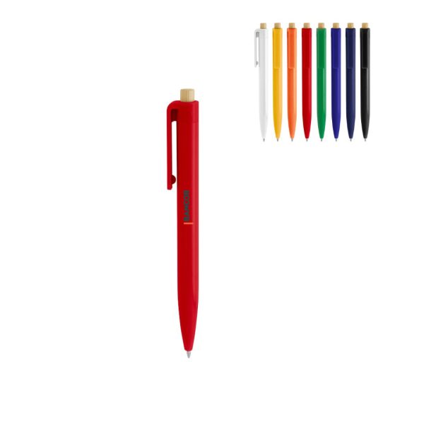 Descripción general del producto: Bolígrafo retráctil. Cuerpo plástico en diferentes colores acabado brillante. Pulsador de bambú. Medidas: 1,05 x 13,5 cm. Materiales: Plástico ABS reciclado y bambú. Peso: 7 g.Tinta: negra.