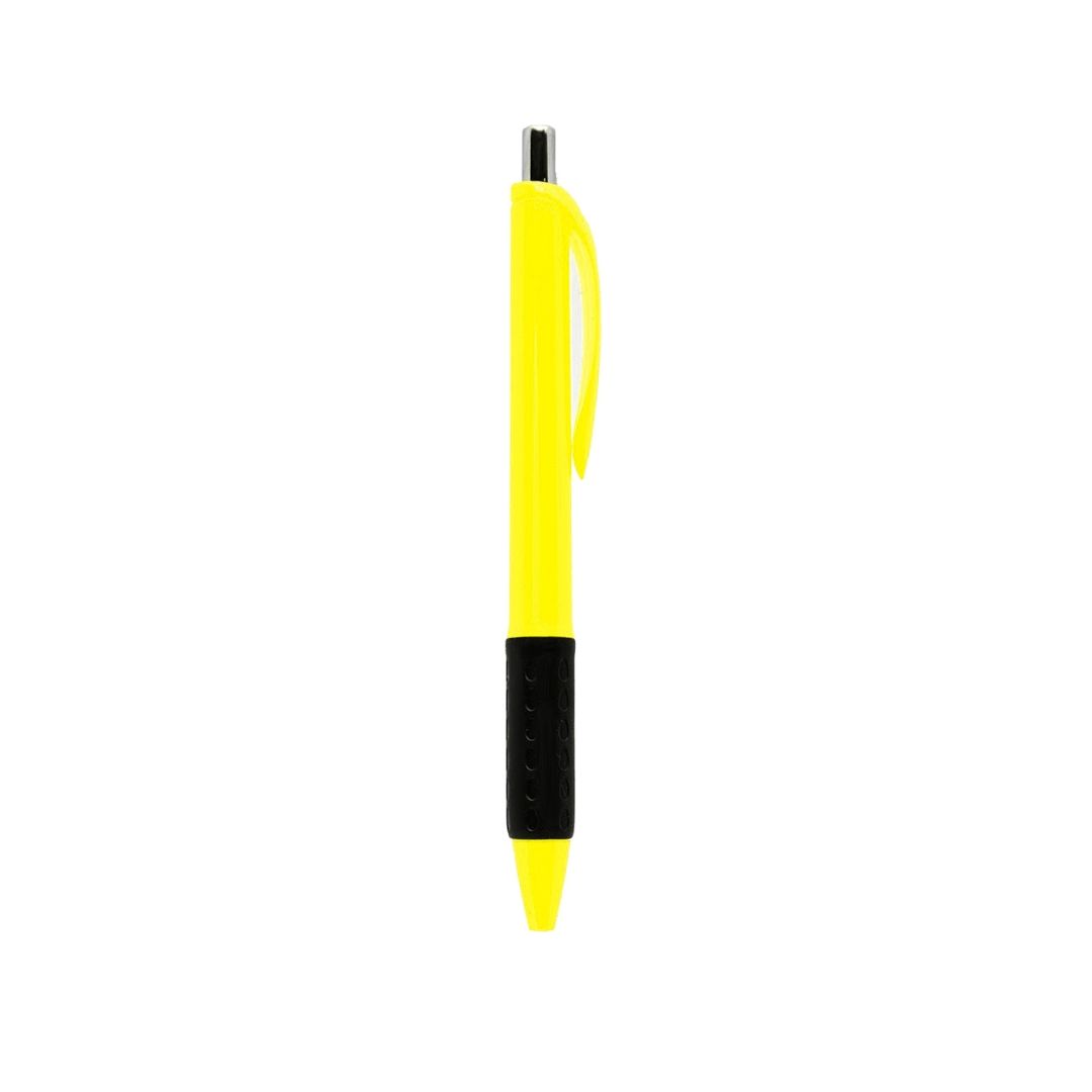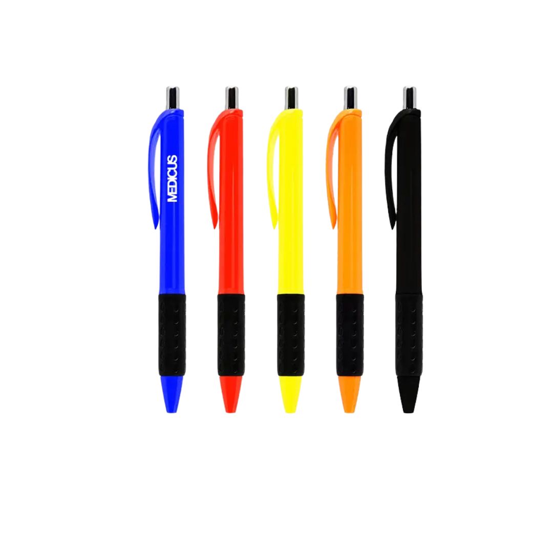 Descripción general del producto: Bolígrafo con cuerpo plástico de color. Grip de goma negro. Pulsador metálico. Retráctil. Tinta negra. Tahg.