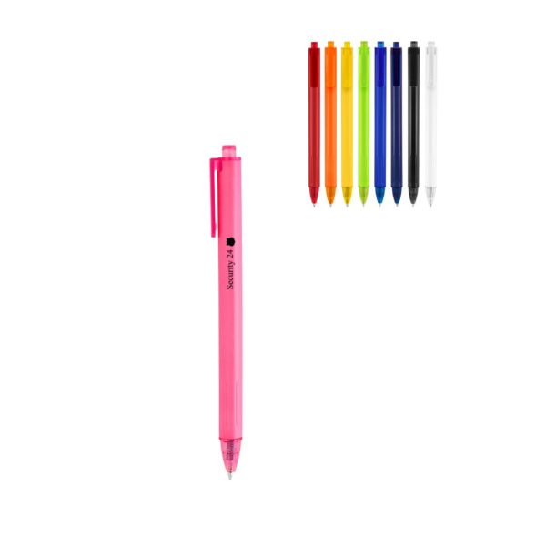 Descripción general del producto: Bolígrafo retráctil. Cuerpo de diferentes colores acabado mate. Pulsador, clip y puntera translucidos del mismo color del cuerpo. Medidas: 1 x 14,3 cm. Materiales: Plástico ABS. Peso: 6,8 g. Tinta: negra.