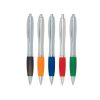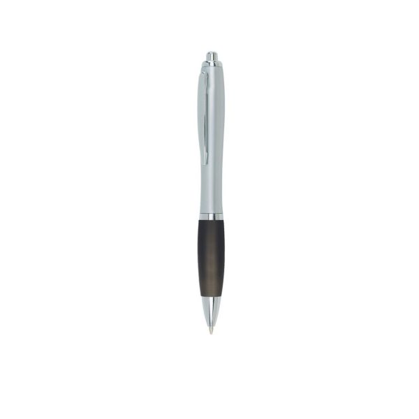 Descripción general del producto: Plástico. Cuerpo curvo, pulsador, clip y puntera color plata. Grip de goma de color. Retráctil. Tinta negra.