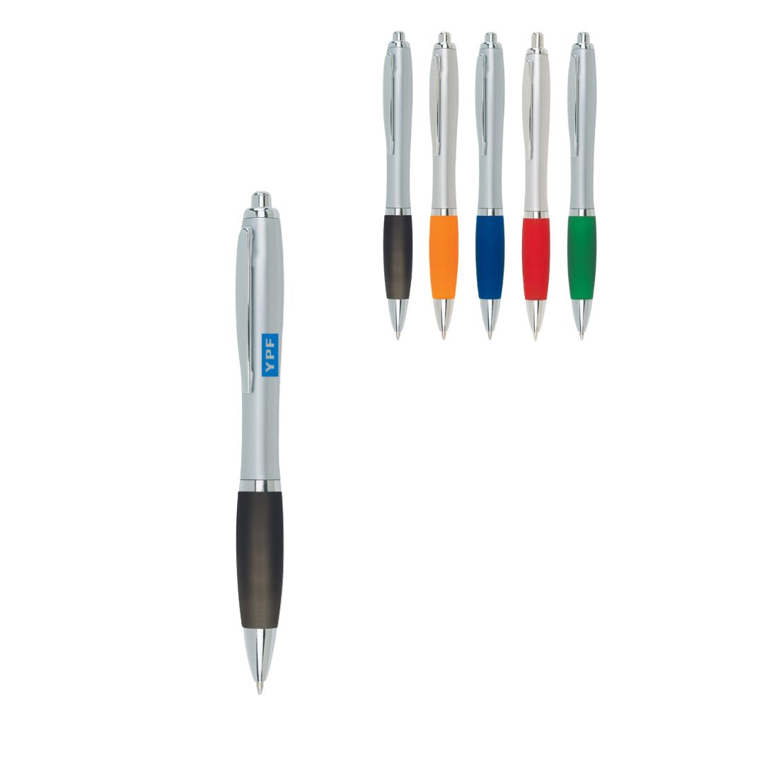 Descripción general del producto: Plástico. Cuerpo curvo, pulsador, clip y puntera color plata. Grip de goma de color. Retráctil. Tinta negra.