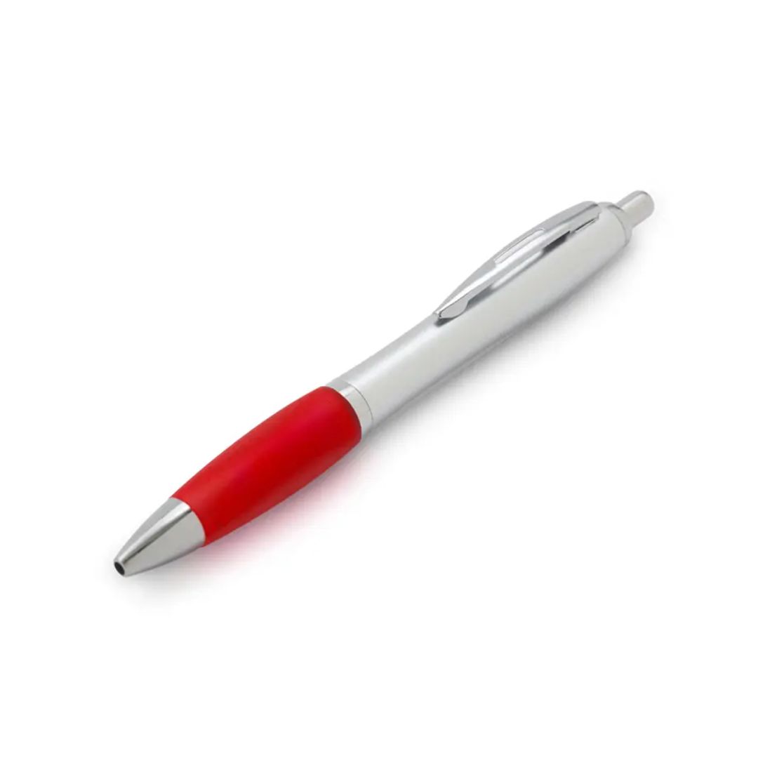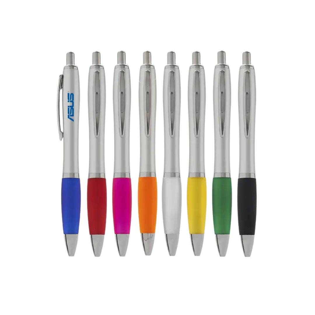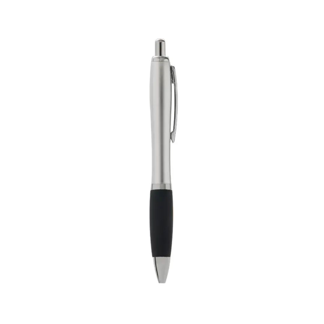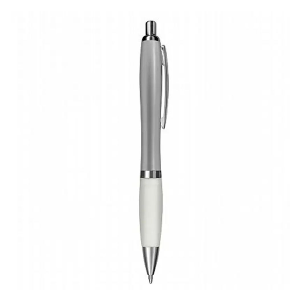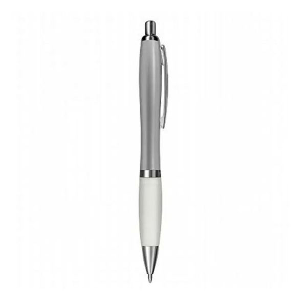 Descripción general del producto: Bolígrafo con cuerpo curvo plástico en acabado plateado. Cuenta con grip de goma de color, clip y botón metálico, mecanismo retráctil y tinta negra. Producto libre de BPA. Tahg.