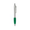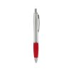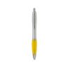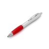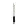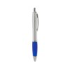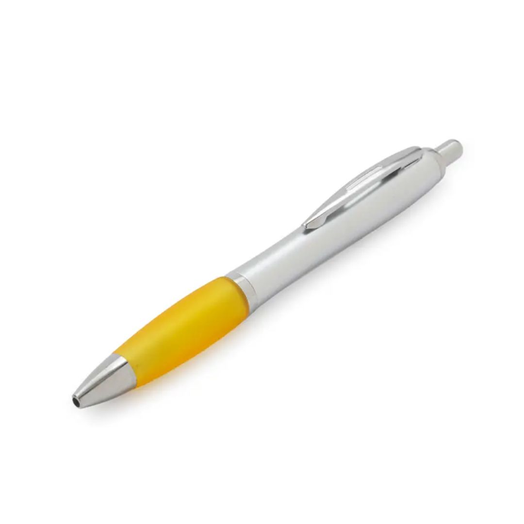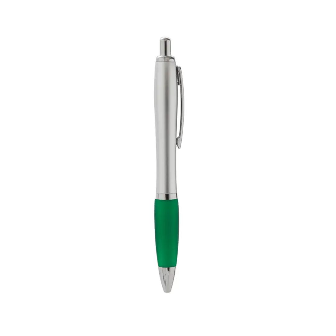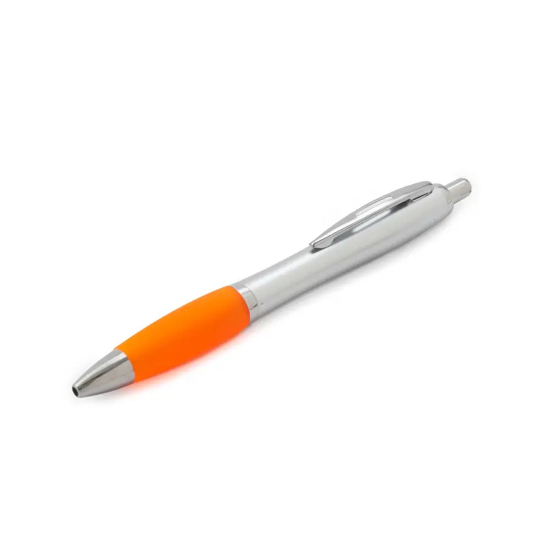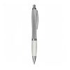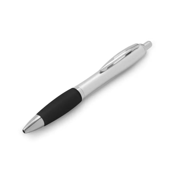 Descripción general del producto: Bolígrafo con cuerpo curvo plástico en acabado plateado. Cuenta con grip de goma de color, clip y botón metálico, mecanismo retráctil y tinta negra. Producto libre de BPA. Tahg.