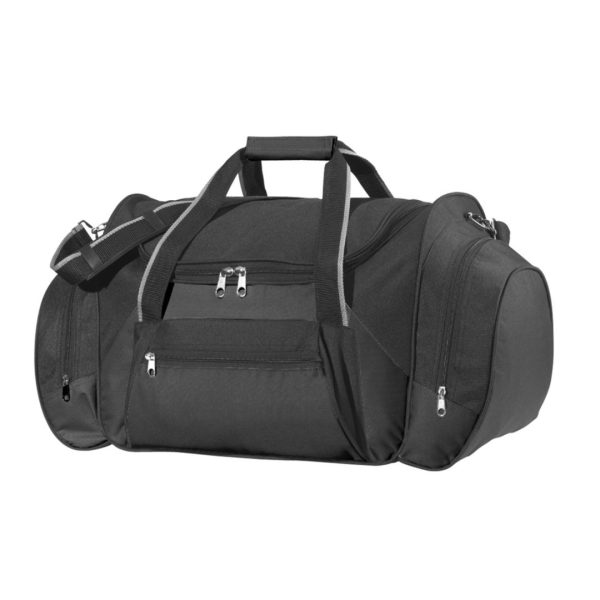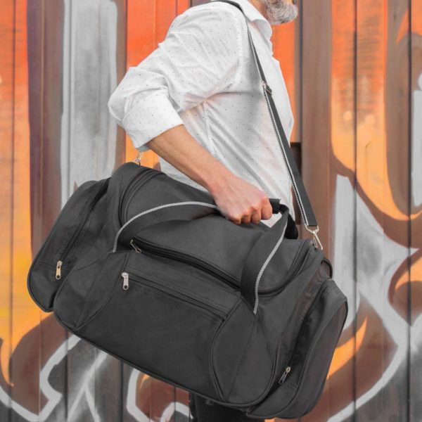 60 x 33 x 29 cm. Capacidad 45 litros aprox. Poliéster 600D. Bolso de viaje o deportivo. Bolsillo frontal y compartimentos laterales externos con cierre. Apertura superior completa con cierre. Herrajes metálicos. Correa regulable y desmontable con hombrera de goma. Manijas con velcro.