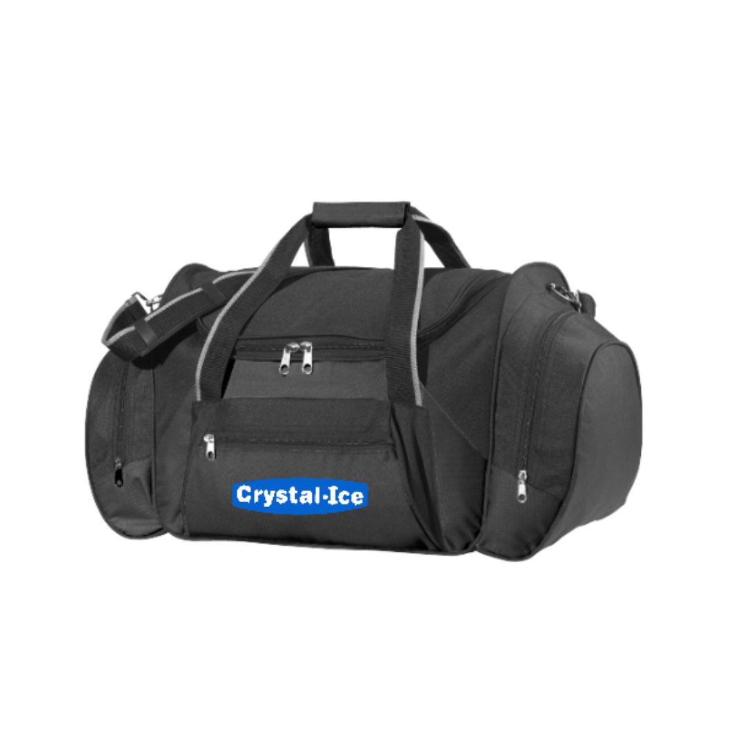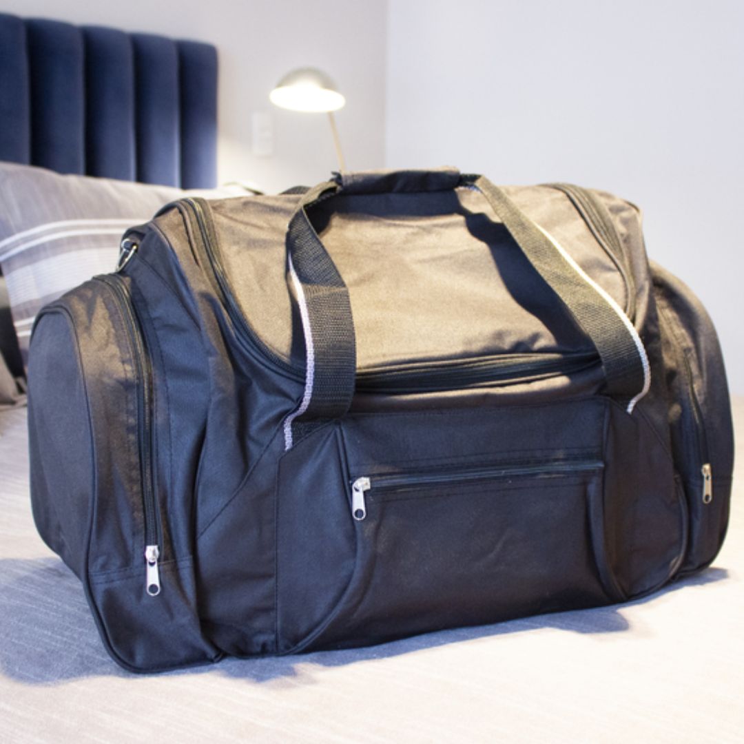 60 x 33 x 29 cm. Capacidad 45 litros aprox. Poliéster 600D. Bolso de viaje o deportivo. Bolsillo frontal y compartimentos laterales externos con cierre. Apertura superior completa con cierre. Herrajes metálicos. Correa regulable y desmontable con hombrera de goma. Manijas con velcro.