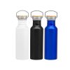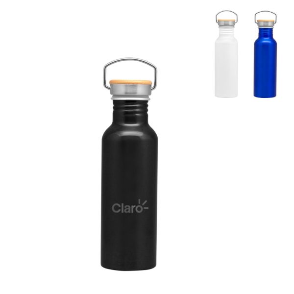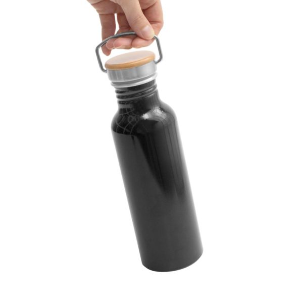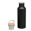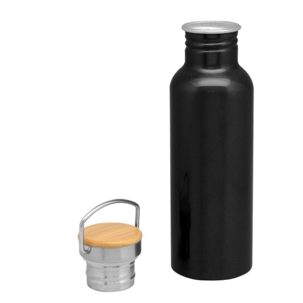 Descripción del producto: 7,3 x 24 cm. Capacidad 750 ml. Aluminio. Tapa de acero con manija metálica rebatible y detalles en bambú. Anillo de silicona antiderrame. Presentación en caja de regalo Kraft.