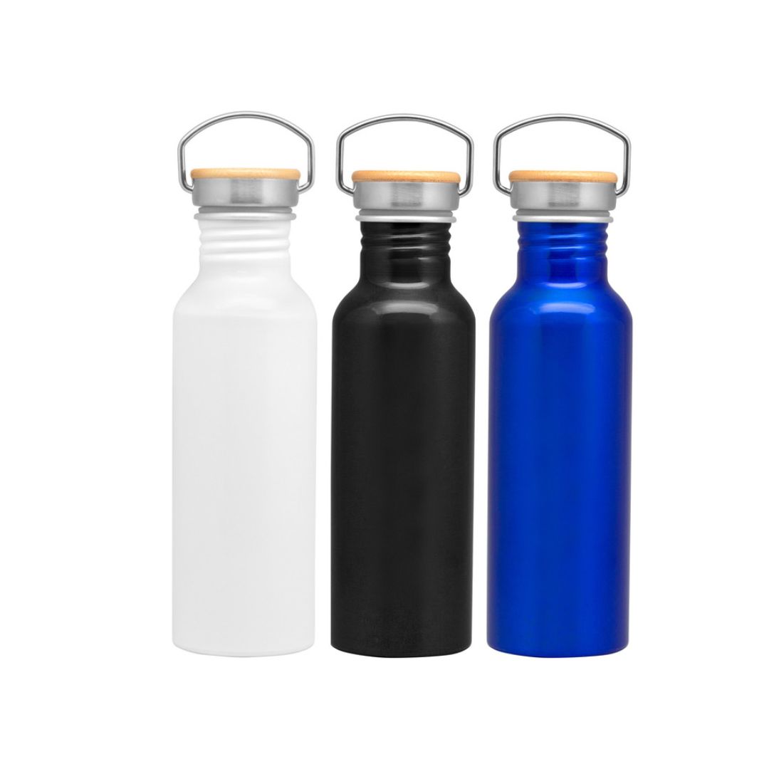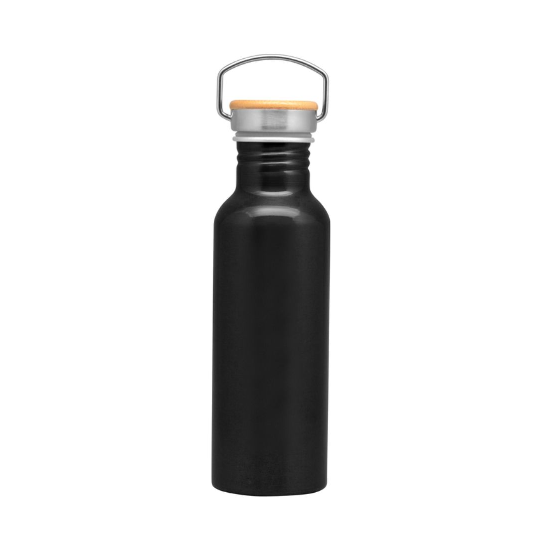 Descripción del producto: 7,3 x 24 cm. Capacidad 750 ml. Aluminio. Tapa de acero con manija metálica rebatible y detalles en bambú. Anillo de silicona antiderrame. Presentación en caja de regalo Kraft.