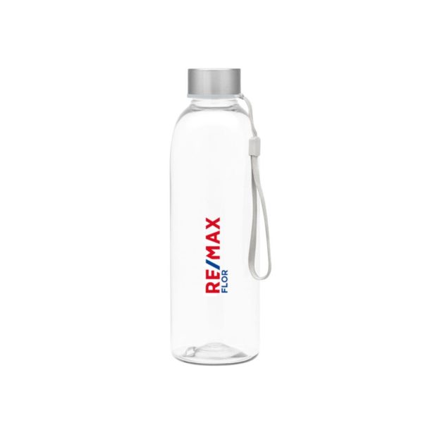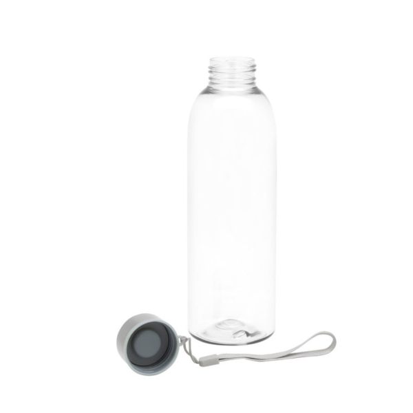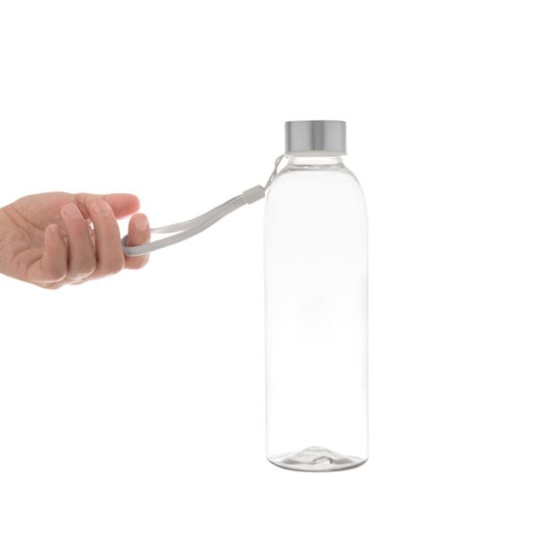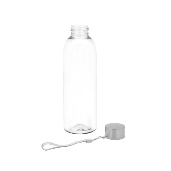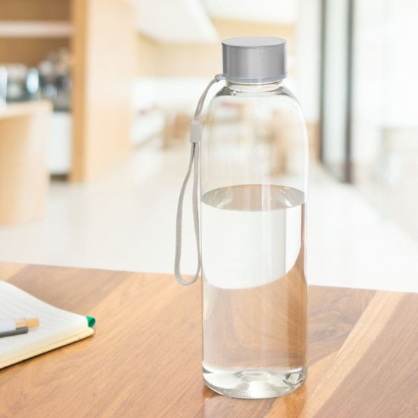 Descripción del producto: 7 x 23 cm. Capacidad 700 ml. Peso de la botella 70 g y de la tapa 15g. Material PET Cristalino. Botella de plástico transparente con tapa a rosca de acero inoxidable, anillo de silicona antiderrame y correa para transportar.