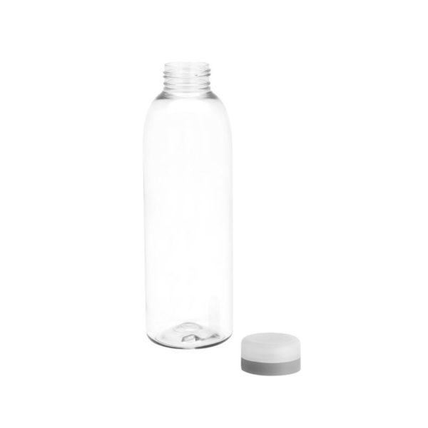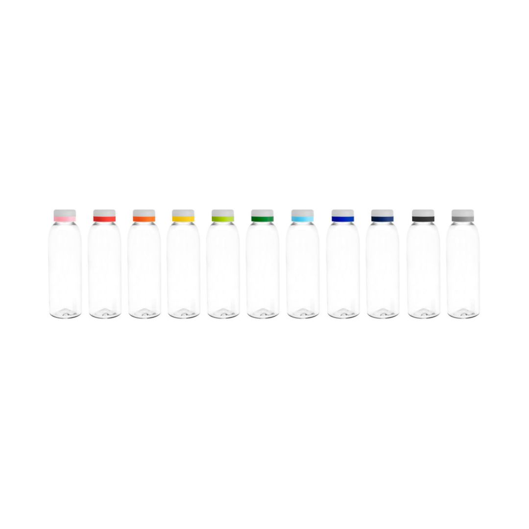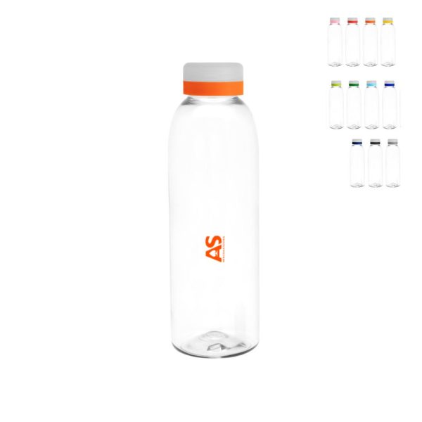 Descirpción del producto: Botella de plástico transparente con tapa a rosca esmerilada con anillo de silicona de diferentes colores. Medidas: 7 x 23 cm. Capacidad: 700 ml. Peso: 70 g. (botella) y 15g. (tapa) Materiales: PET Cristalino.