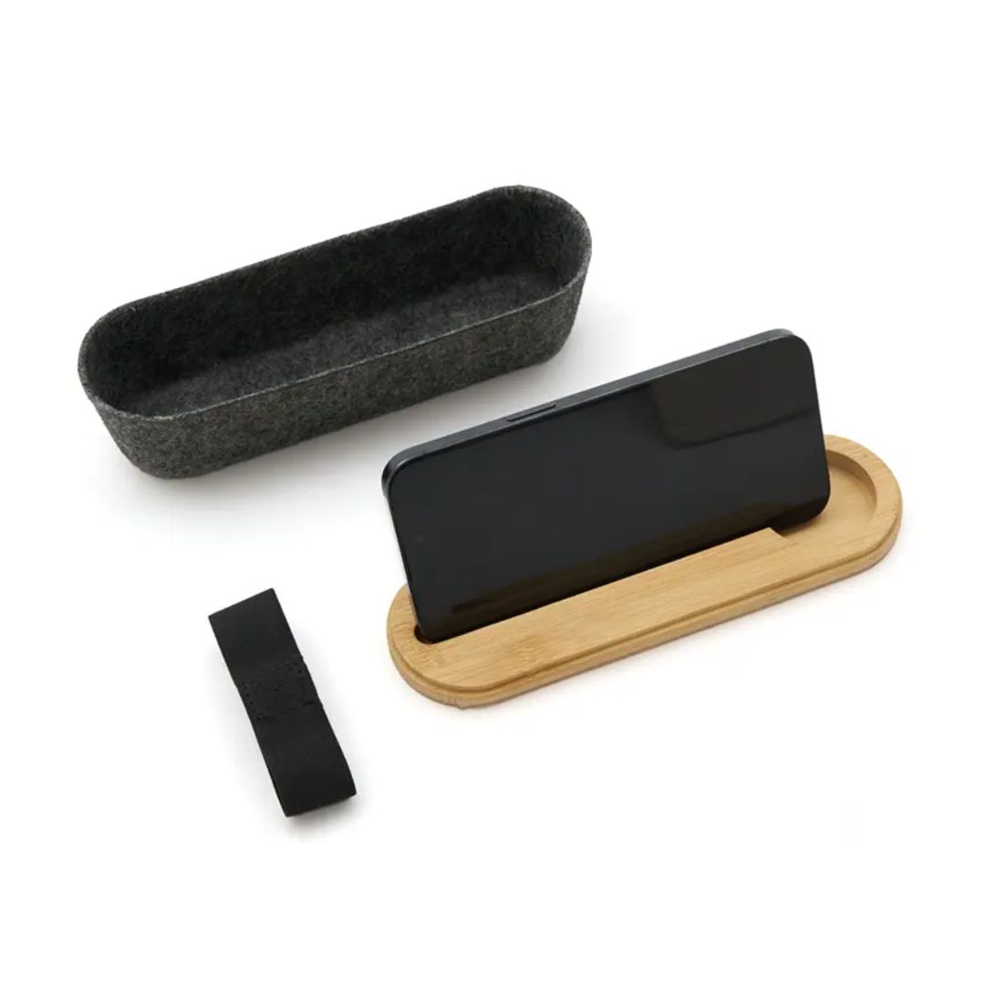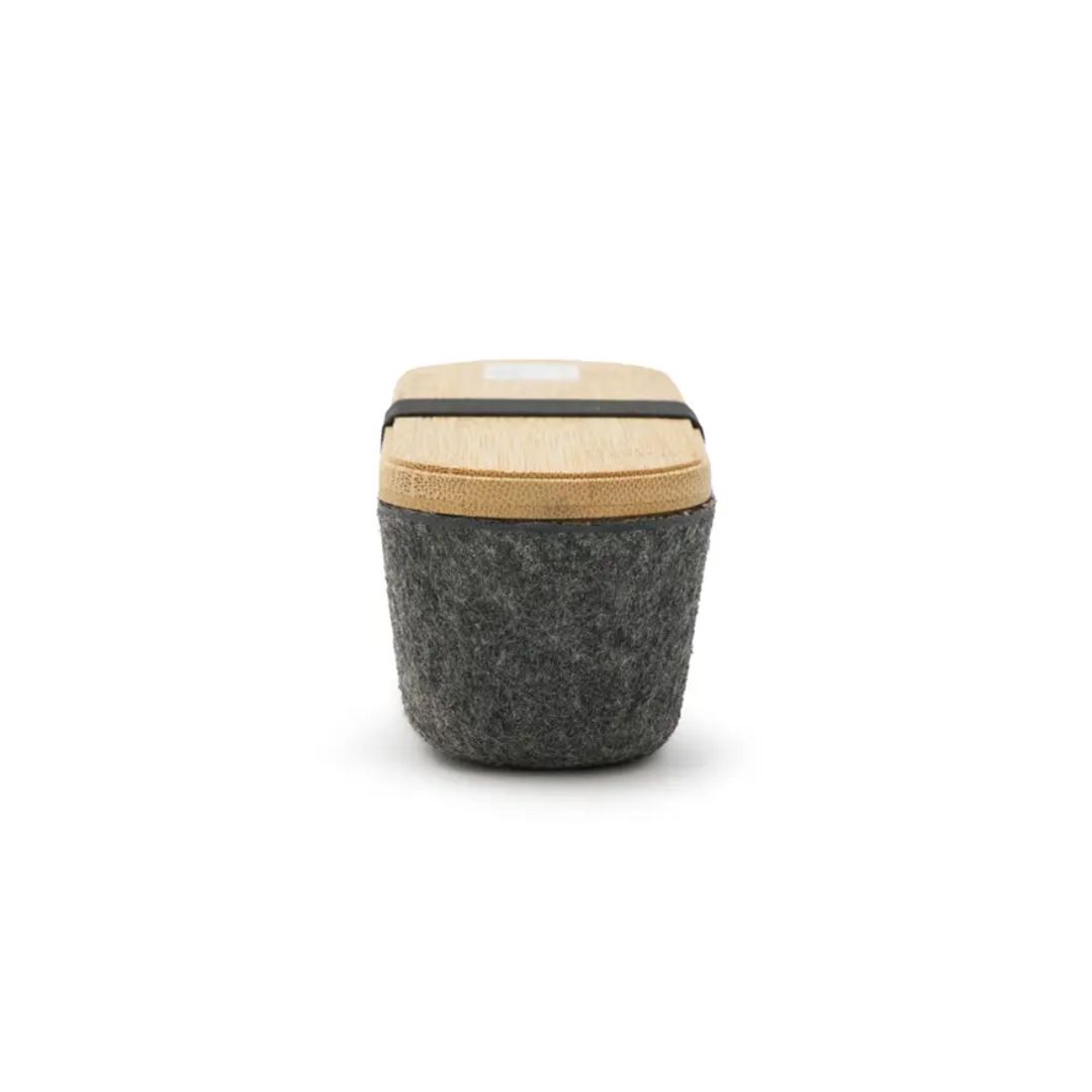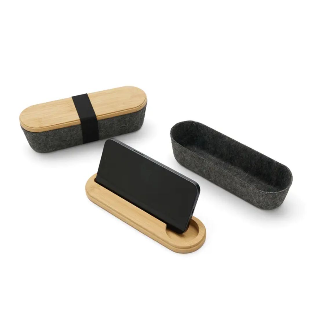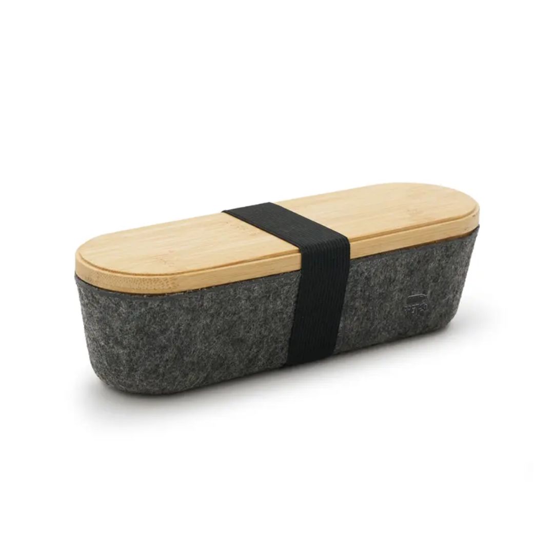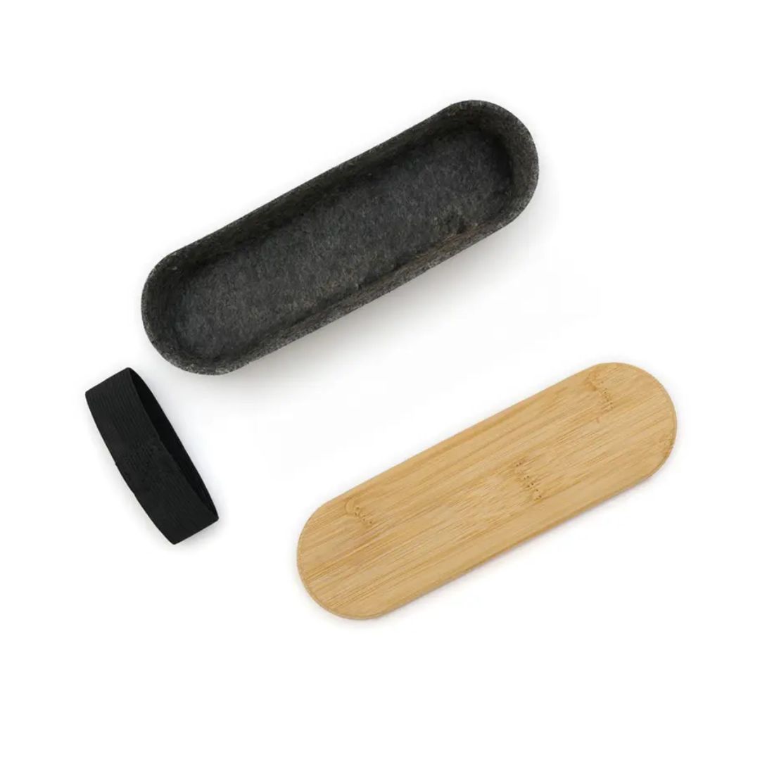 Descripción general del producto: Estuche ideal para ser utilizado como cartuchera o portaobjetos. Está confeccionado en fieltro RPET reciclado y tapa de bambú natural, lo que la convierte en una opción sostenible, resistente y con un diseño moderno. ReUseMe.
