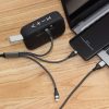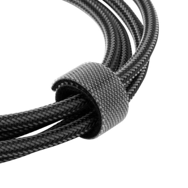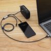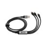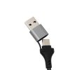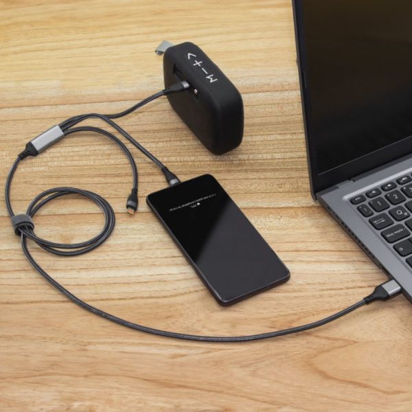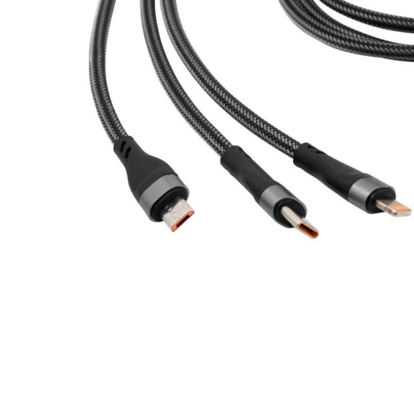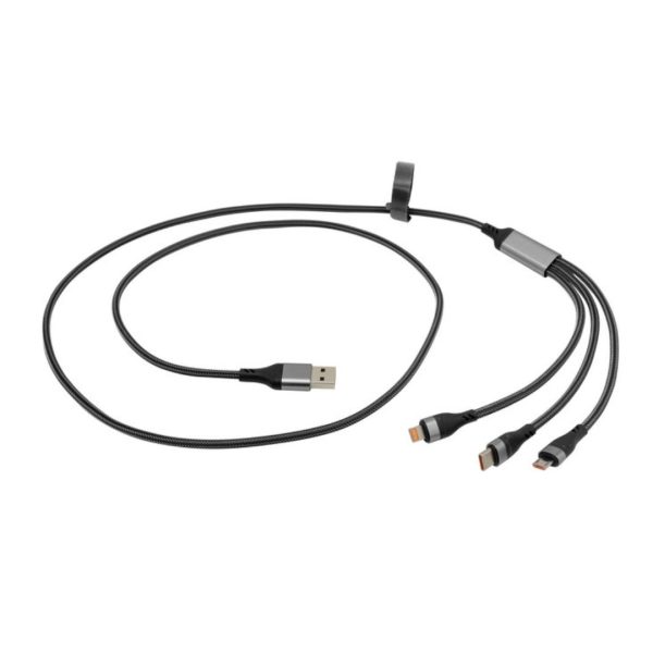 Descripción del producto: Cable de carga rápida. Entrada 2 en 1: USB y USB-C. Salida: USB-C, microUSB y lightning. Max 20V 3A. Color gun con toques naranjas en cada conector. Precinto de velcro fijada al cable.
