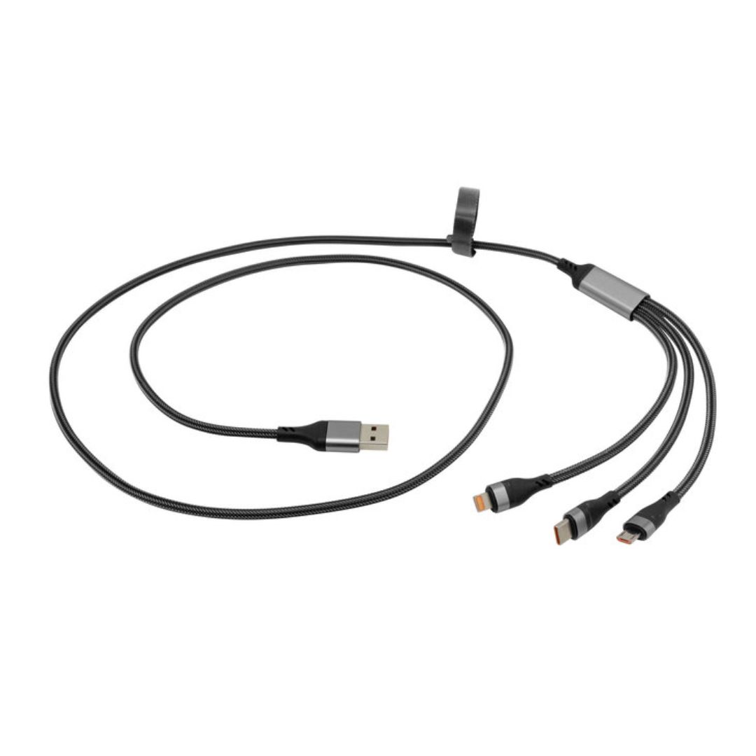Descripción del producto: Cable de carga rápida. Entrada 2 en 1: USB y USB-C. Salida: USB-C, microUSB y lightning. Max 20V 3A. Color gun con toques naranjas en cada conector. Precinto de velcro fijada al cable.
