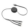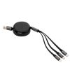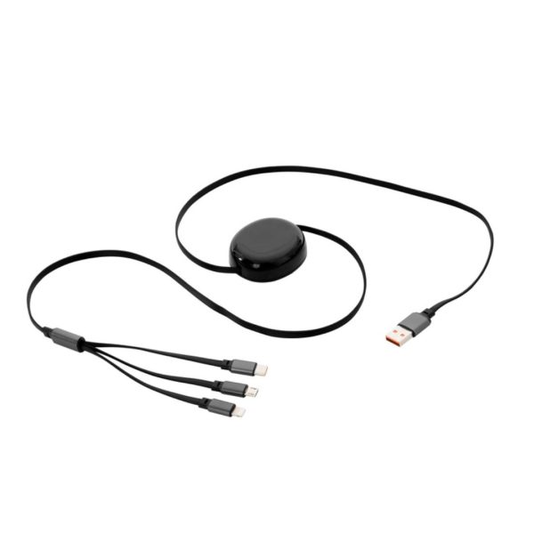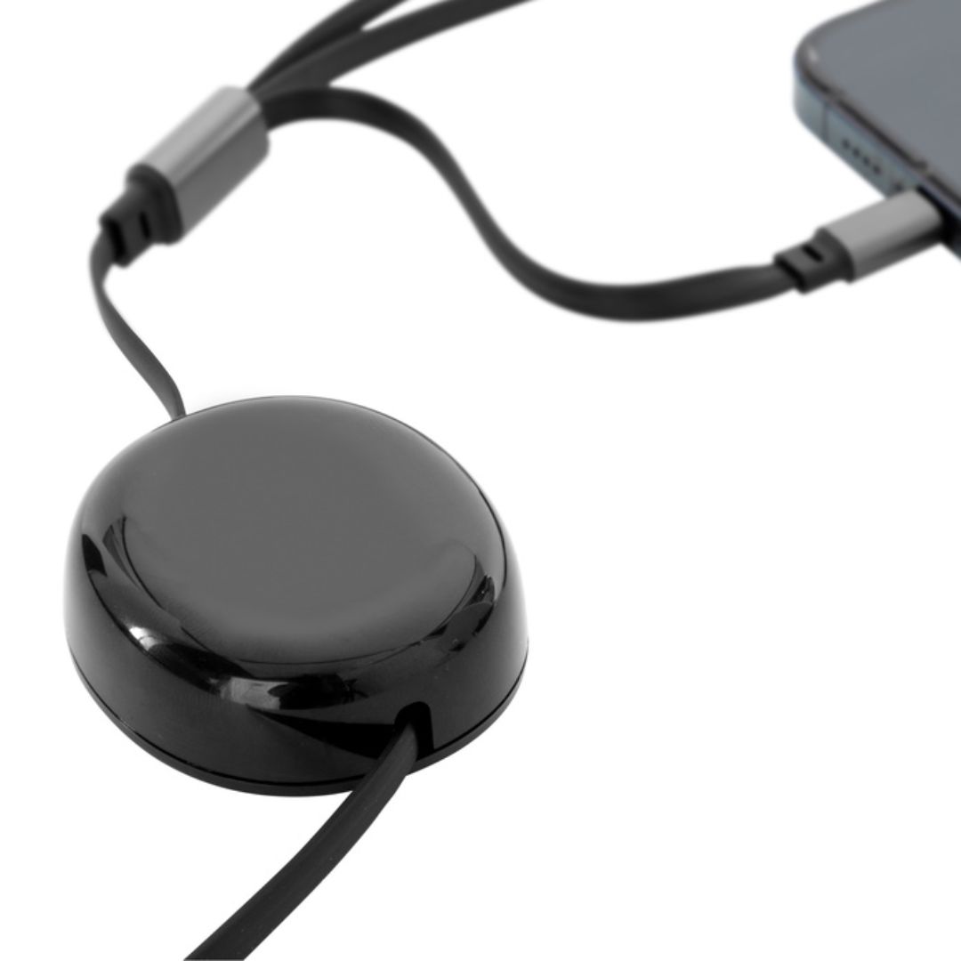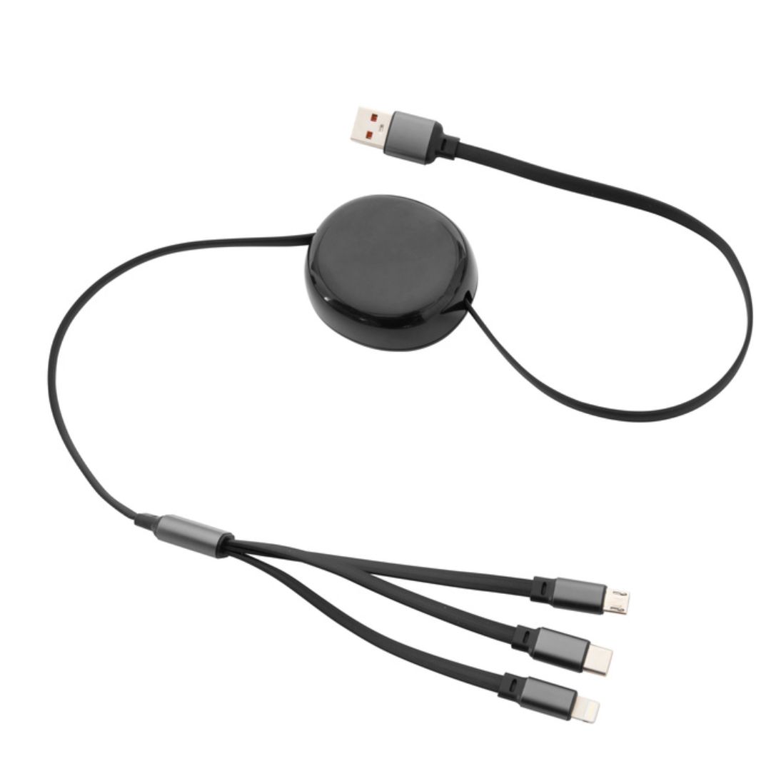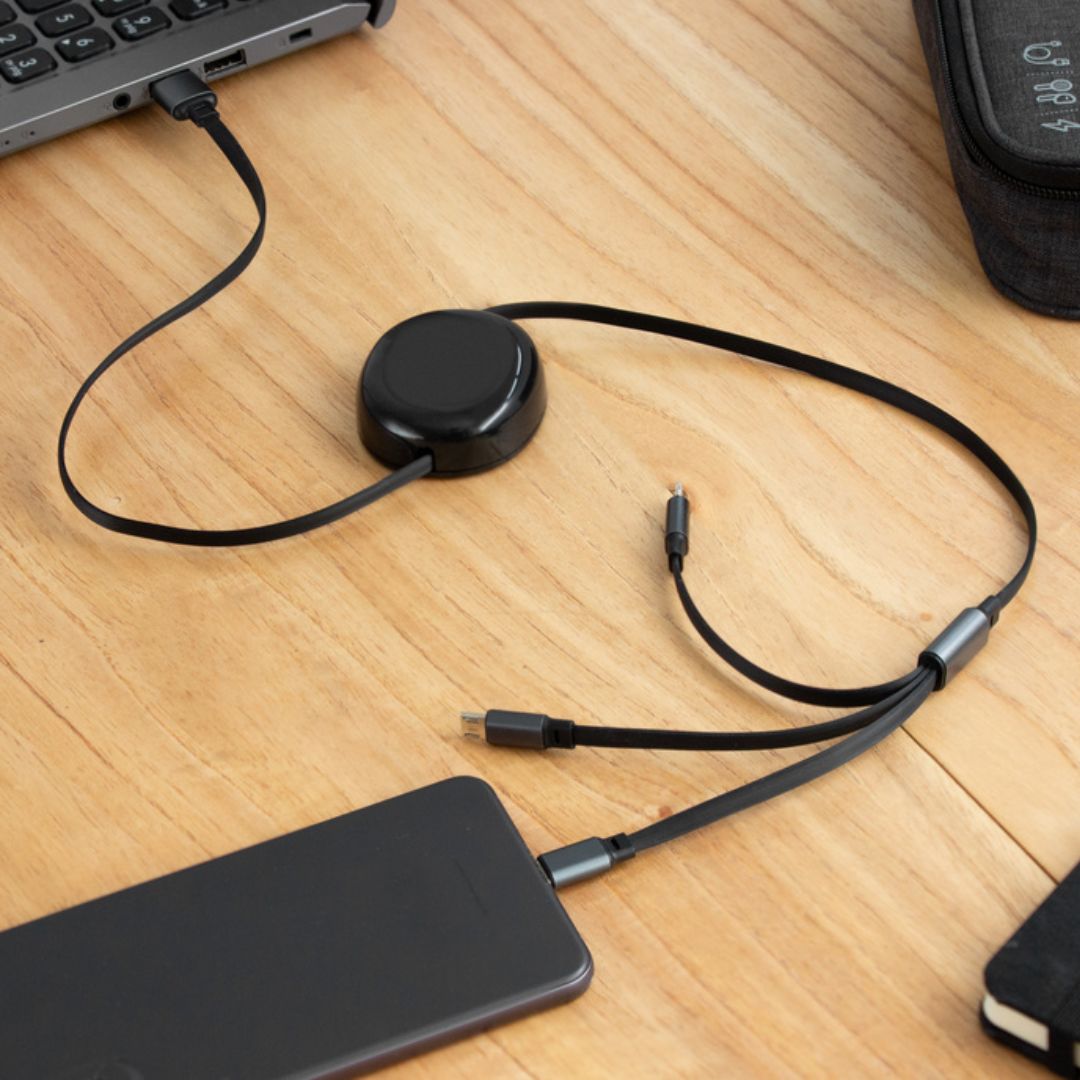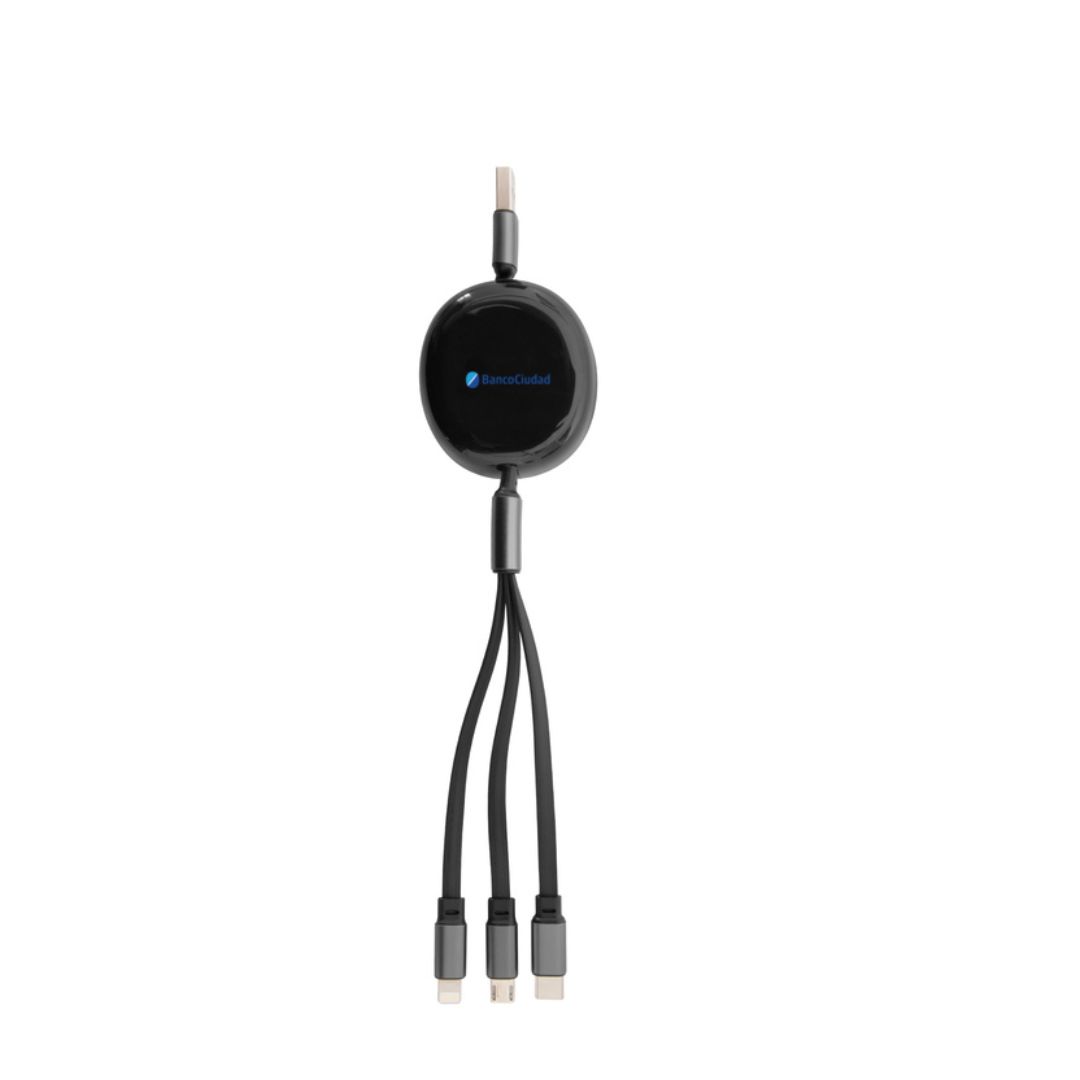 Descripción general del producto: Cable de carga retráctil con longitud de hasta 115 cm. 3 en 1. Posee tres conectores (Lightning, USB-C y USB standard).
