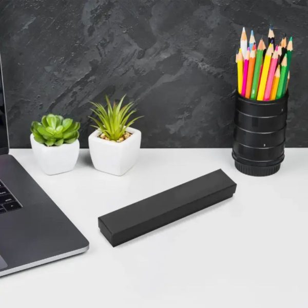 Descripción general del producto: Caja individual para bolígrafos, ideal para presentar tu regalo de manera sofisticada y profesional. Diseñada en papel color negro y un tamaño de 16,3 x 3 x 2 cm, es compatible con la mayoría de las lapiceras estándar. Ligera y resistente, es excelente para aumentar el valor percibido del regalo. Tahg. NO INCLUYE BOLÍGRAFO.