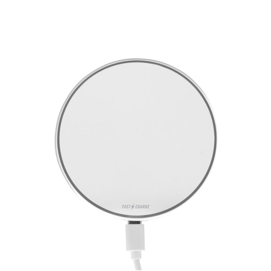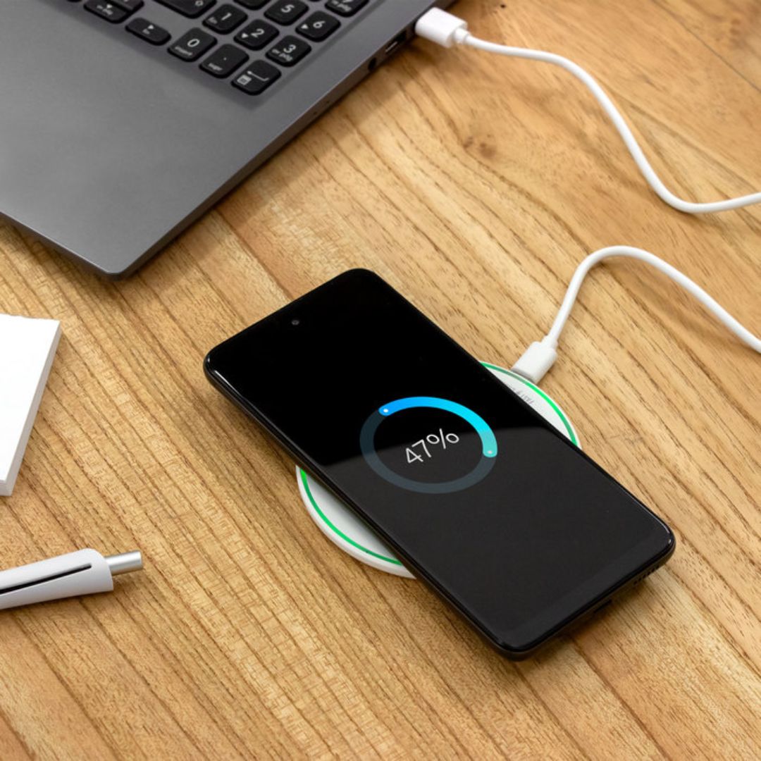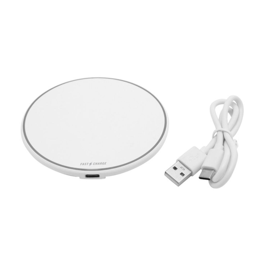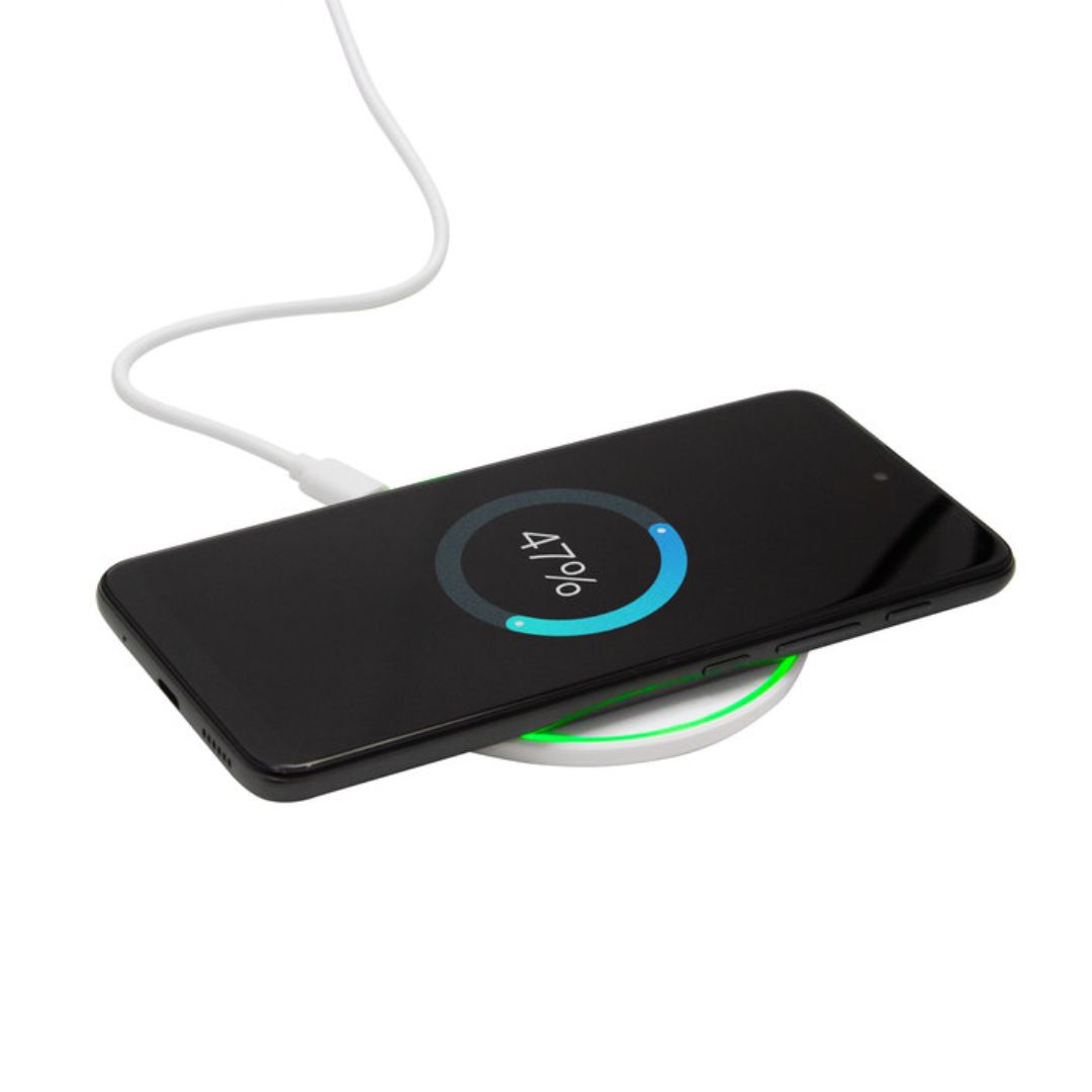 Descripción general del producto: Cargador inalámbrico con luz. Base plástica color blanco con antideslizantes. CARGA RÁPIDA. Salida: 15 watts. Luces indicadoras de carga. Cable de carga USB-C en color blanco de 50 cm de largo. Compatible exclusivamente con celulares que permitan carga inalámbrica (tecnología qi).