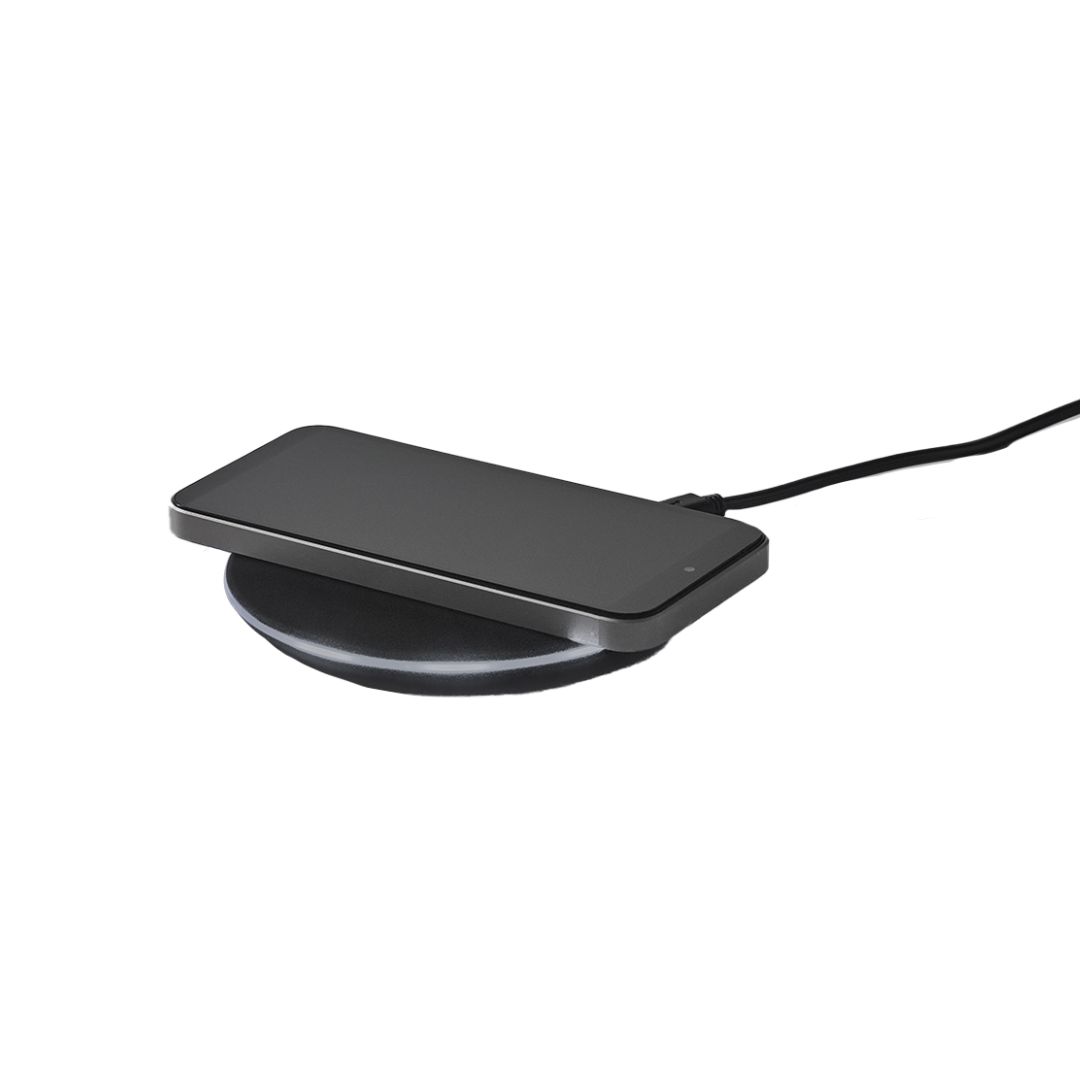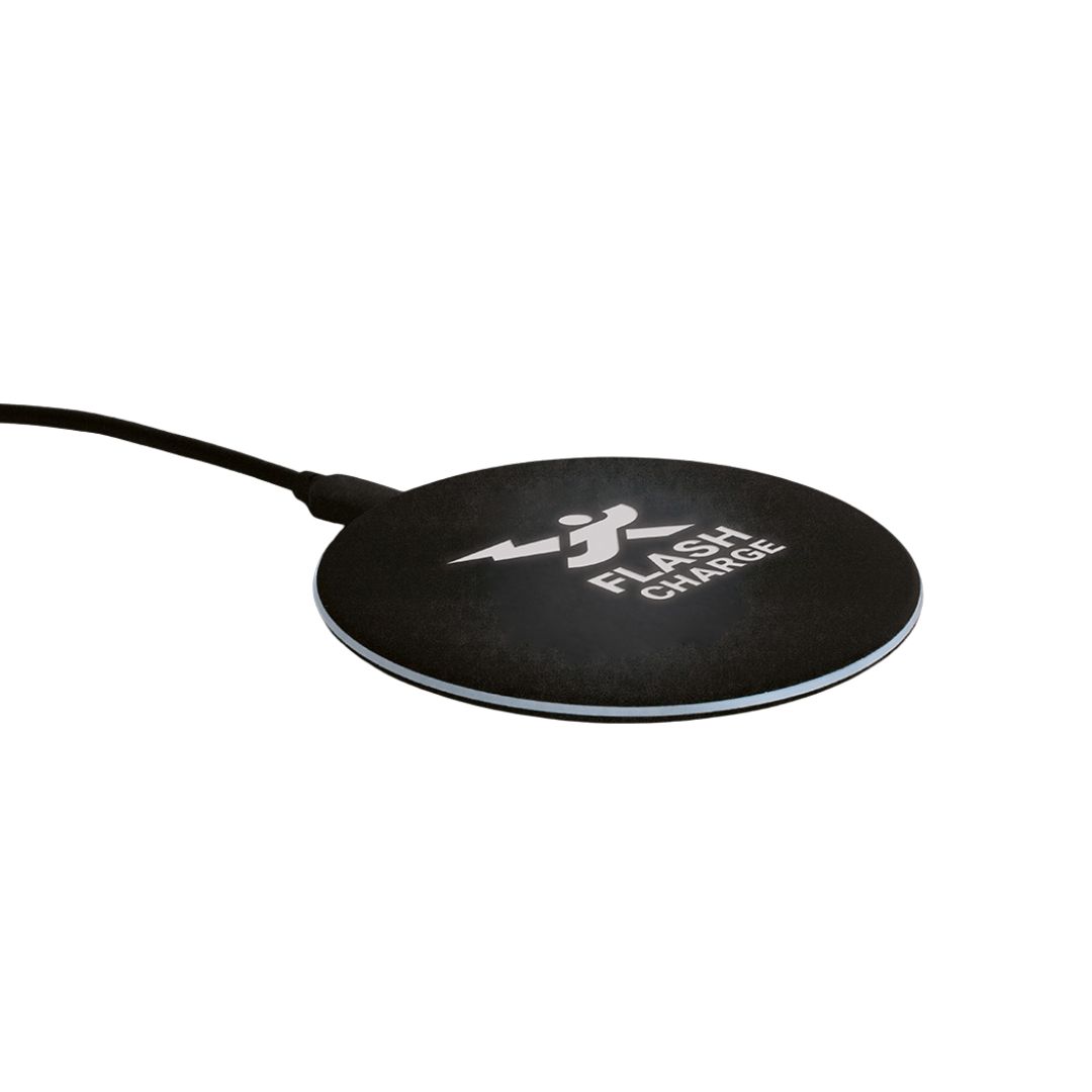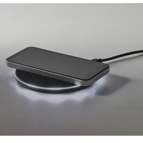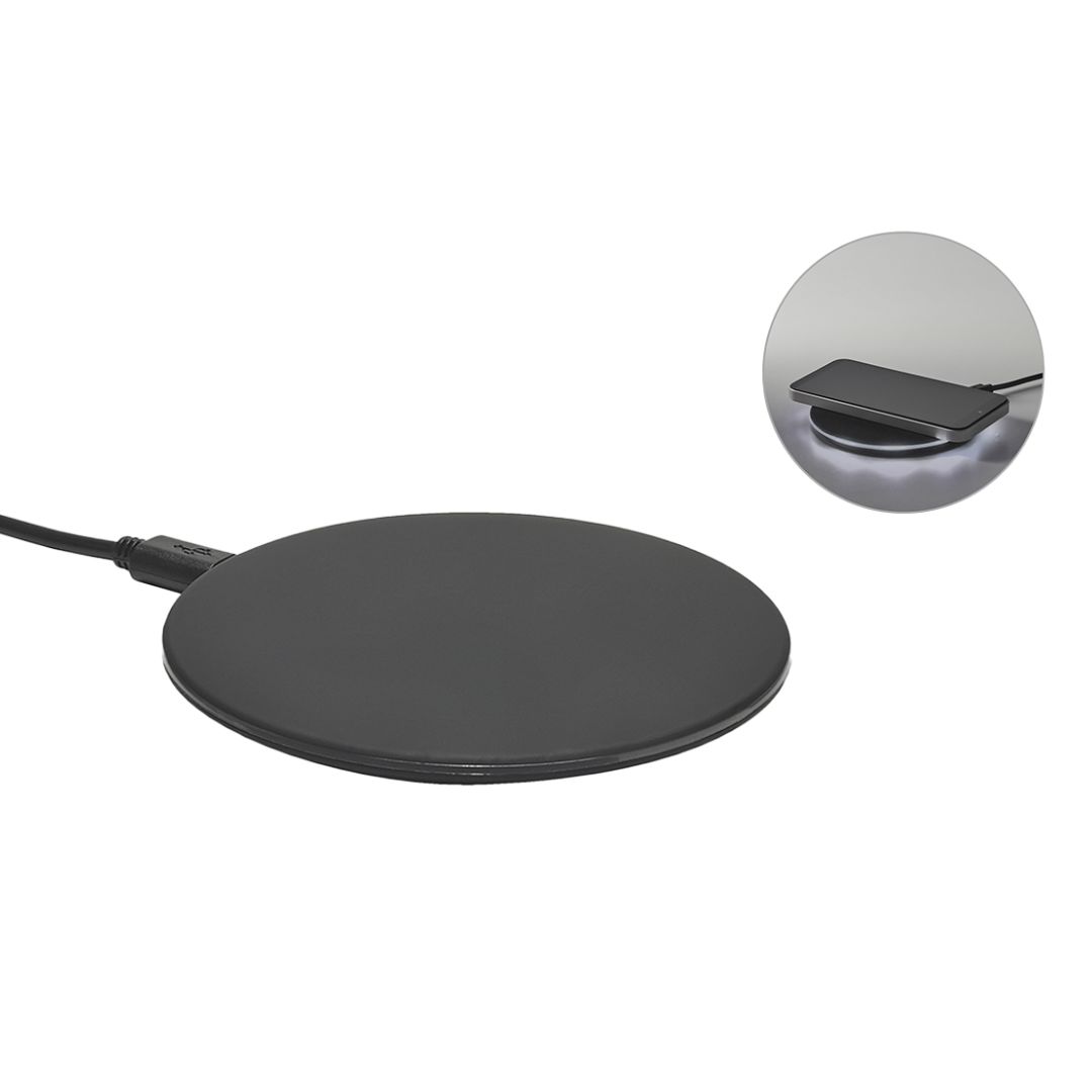 Descripción del producto: Cargador inalámbrico con luz en el interior. Cargador inalámbrico con entradas 5V/2A y 9V/1.67A y una potencia máxima de salida de 10W. Incluye un cable USB que permite la carga rápida. Posee una luz que ilumina el logo grabado. Compatible con smartphones con tecnología de carga inalámbrica. Material: ABS con acabado en goma.
