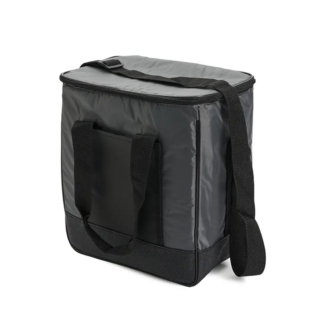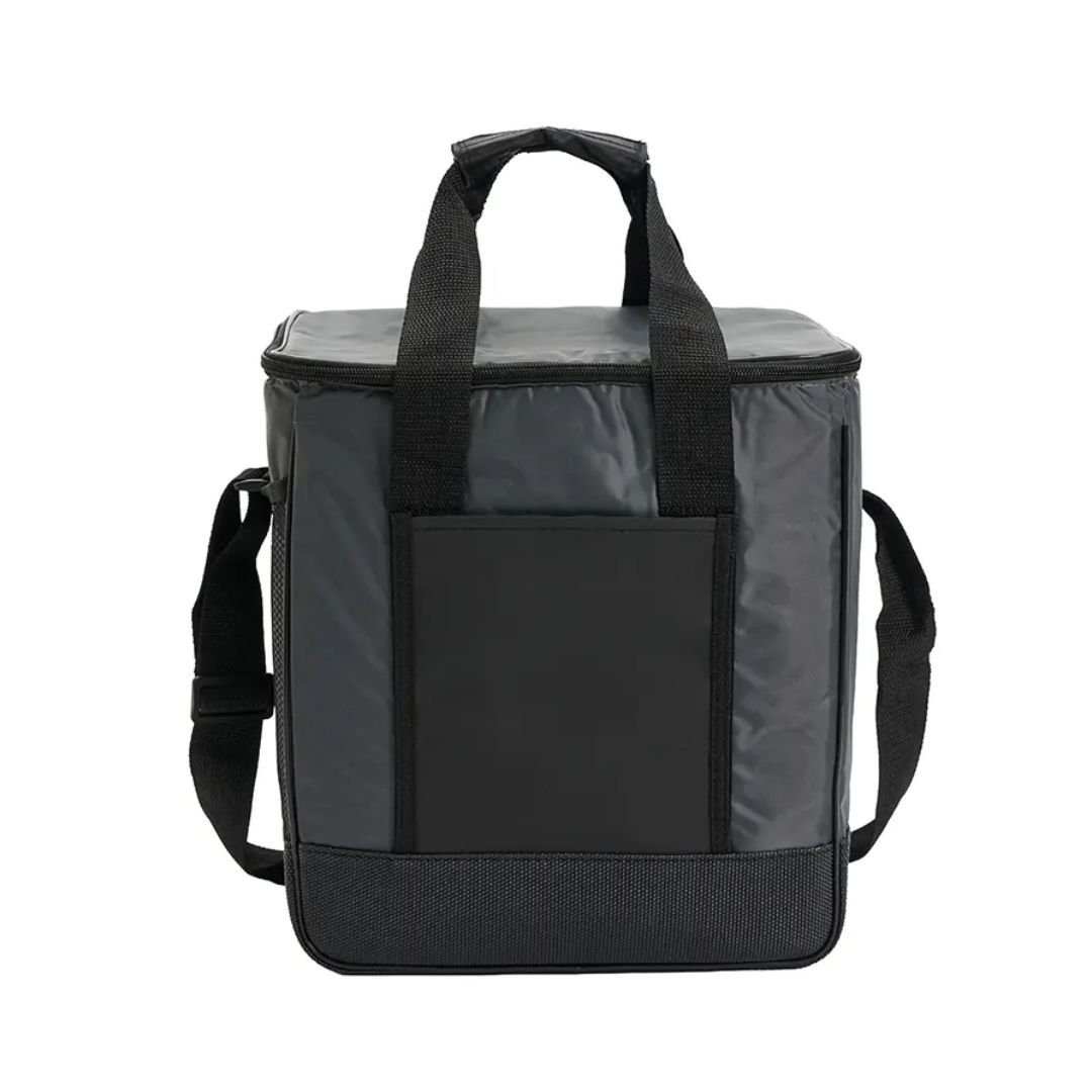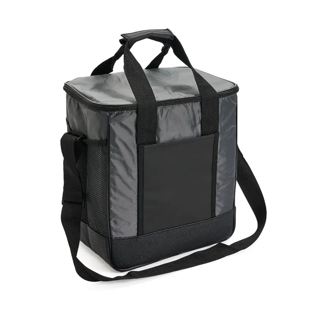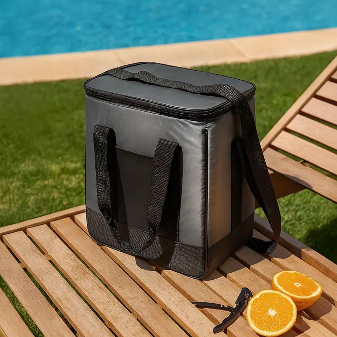 Descripción del producto: Cooler con doble asa y correa regulable. Está confeccionado en tela 70D, con interior de aluminio y espuma PE. Cuenta con compartimiento principal con cierre, bolsillo frontal y dos asas superiores reforzadas. Es ideal para conservar alimentos y bebidas en salidas o traslados.