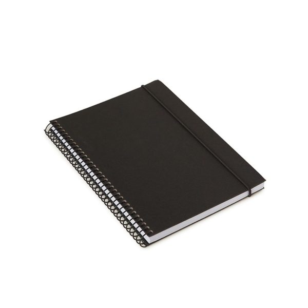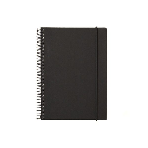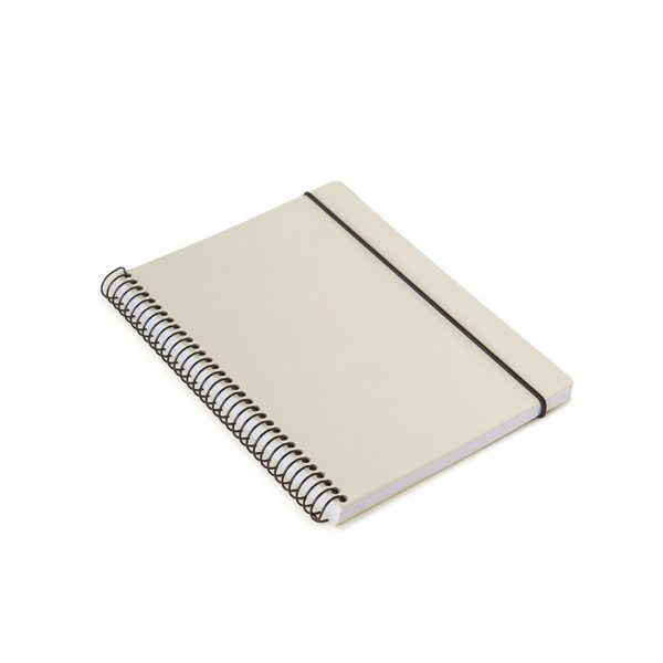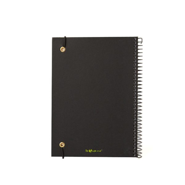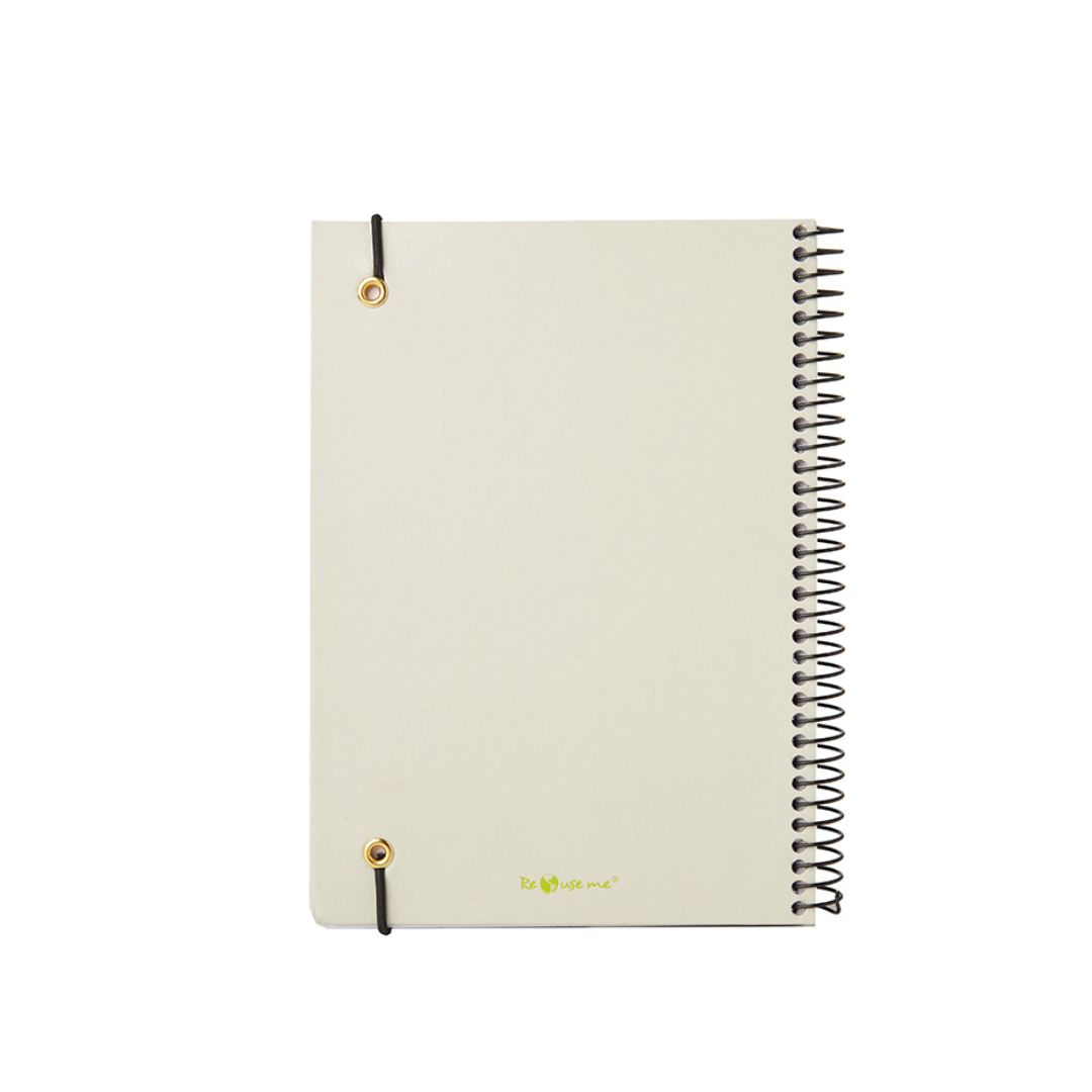 Descripción general del producto: Cuaderno anillado con tapa confeccionado con papel Kraft y 100 hojas lisas de 170 gr. Cuenta con un cierre elástico. Medidas : 14,8 x 21,2 cm. Se presenta protegido en bolsa. ReUseMe.