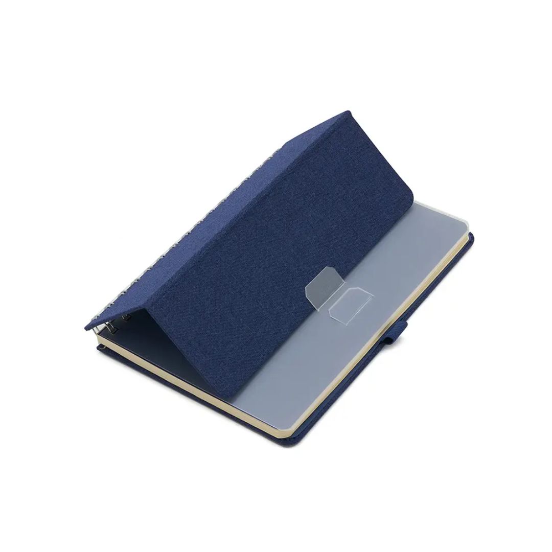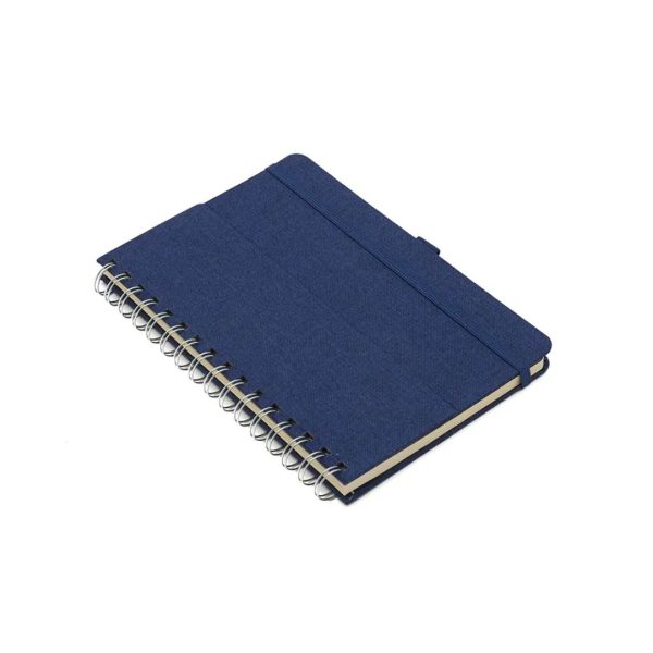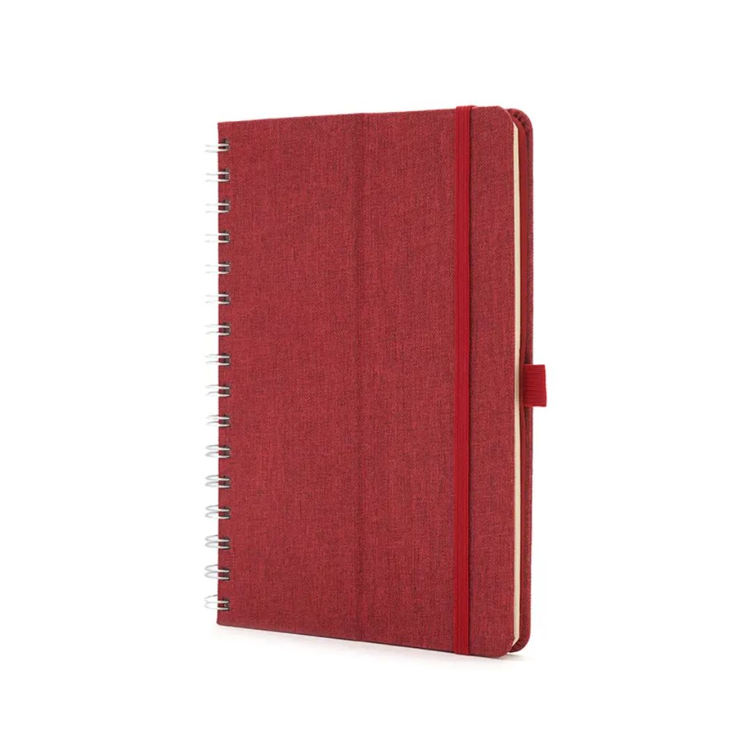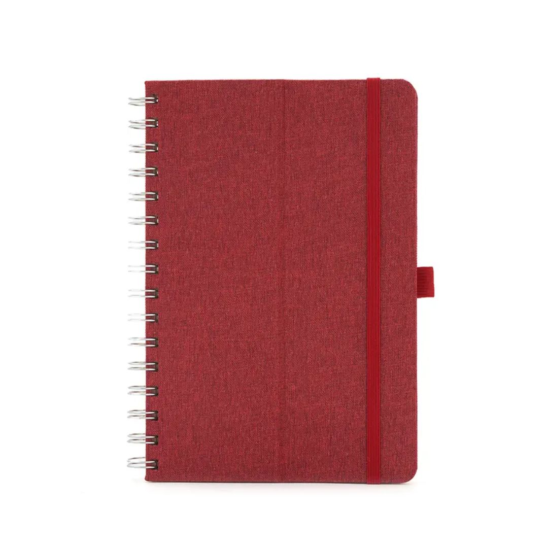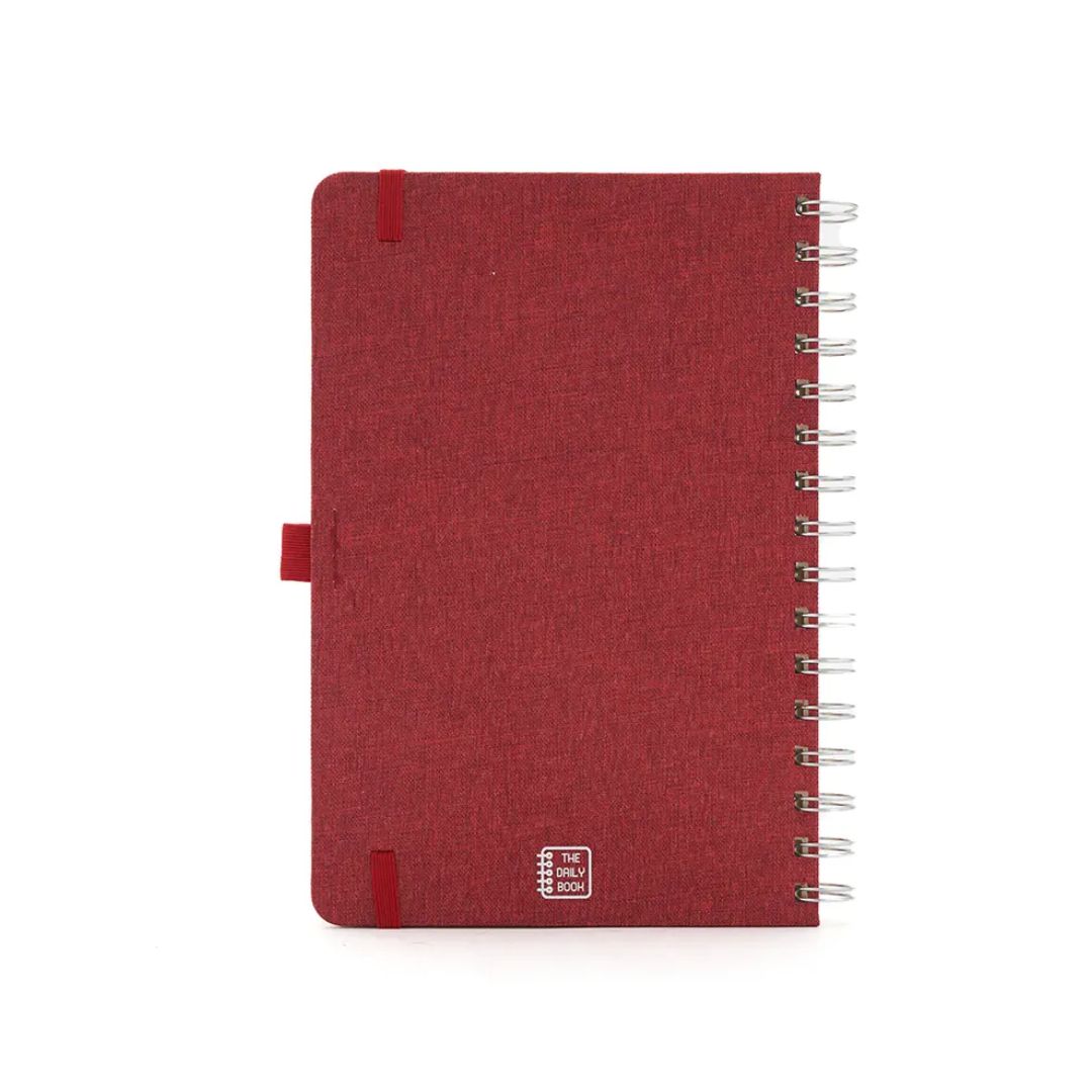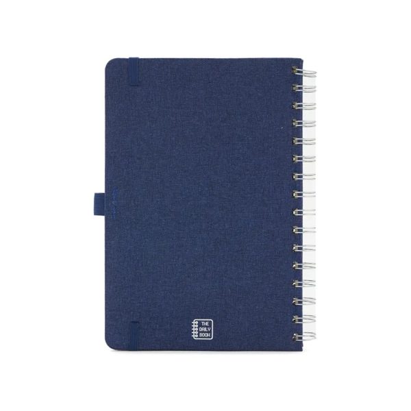 Descripción general del producto: Cuaderno anillado de 80 hojas lisas de 70gr. Tapa dura confeccionada en RPET, material hecho con botellas de plástico recicladas. Su tapa delantera puede doblarse, creando un soporte para teléfono. Cuenta con cierre elástico y porta lapicera. Colores disponibles: gris, rojo y azul. Medidas: 21 x 15 cm (Altura x Ancho). The Daily Book.