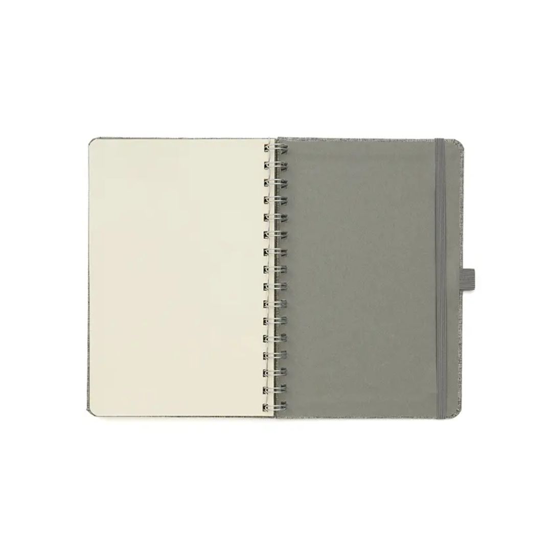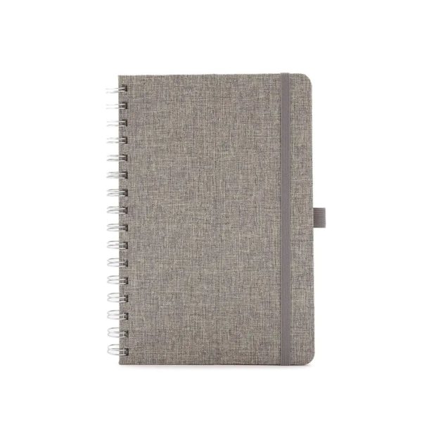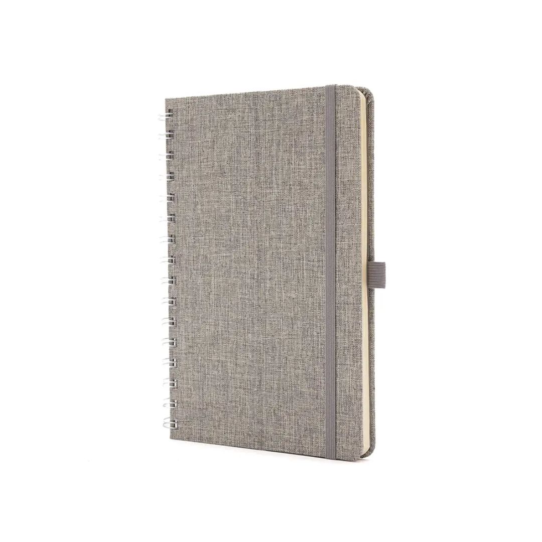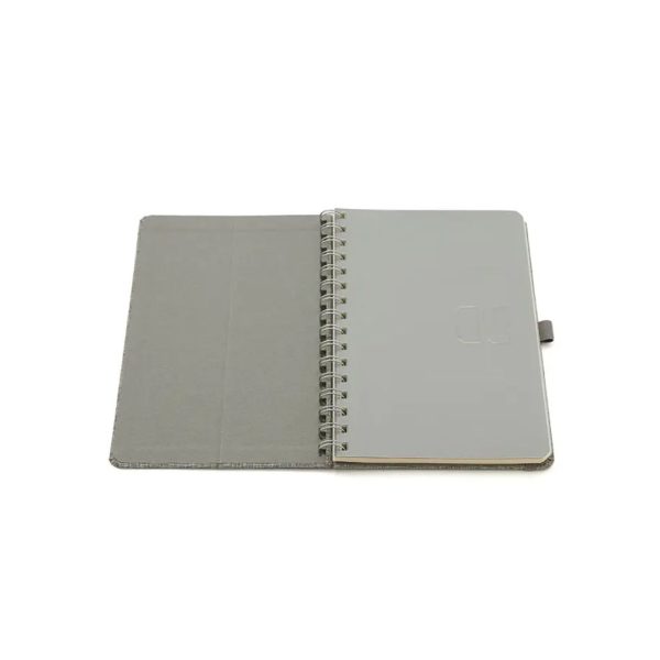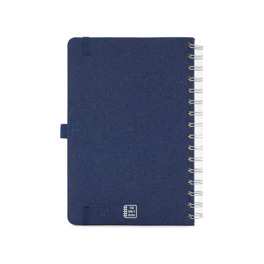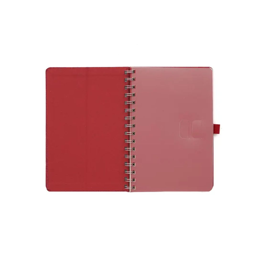 Descripción general del producto: Cuaderno anillado de 80 hojas lisas de 70gr. Tapa dura confeccionada en RPET, material hecho con botellas de plástico recicladas. Su tapa delantera puede doblarse, creando un soporte para teléfono. Cuenta con cierre elástico y porta lapicera. Colores disponibles: gris, rojo y azul. Medidas: 21 x 15 cm (Altura x Ancho). The Daily Book.