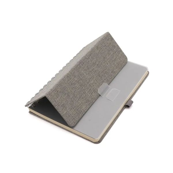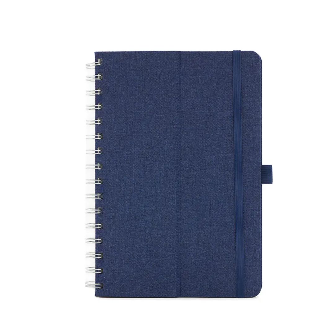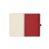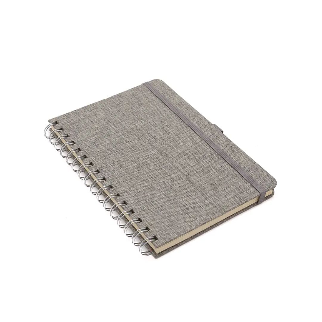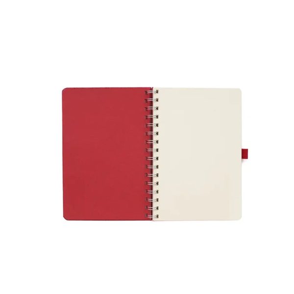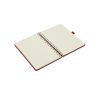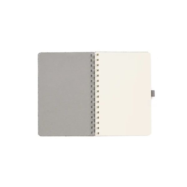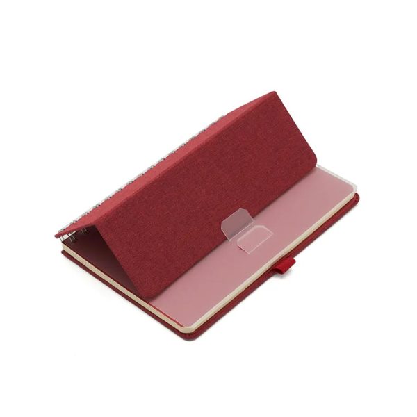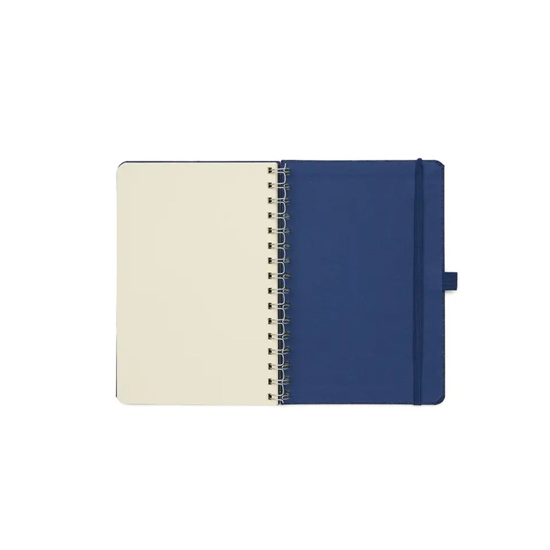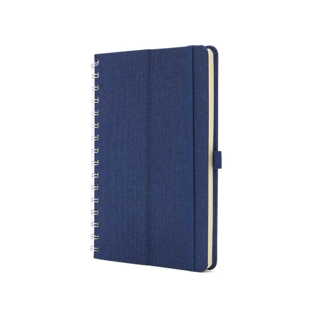 Descripción general del producto: Cuaderno anillado de 80 hojas lisas de 70gr. Tapa dura confeccionada en RPET, material hecho con botellas de plástico recicladas. Su tapa delantera puede doblarse, creando un soporte para teléfono. Cuenta con cierre elástico y porta lapicera. Colores disponibles: gris, rojo y azul. Medidas: 21 x 15 cm (Altura x Ancho). The Daily Book.