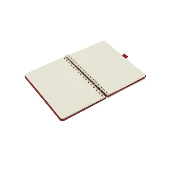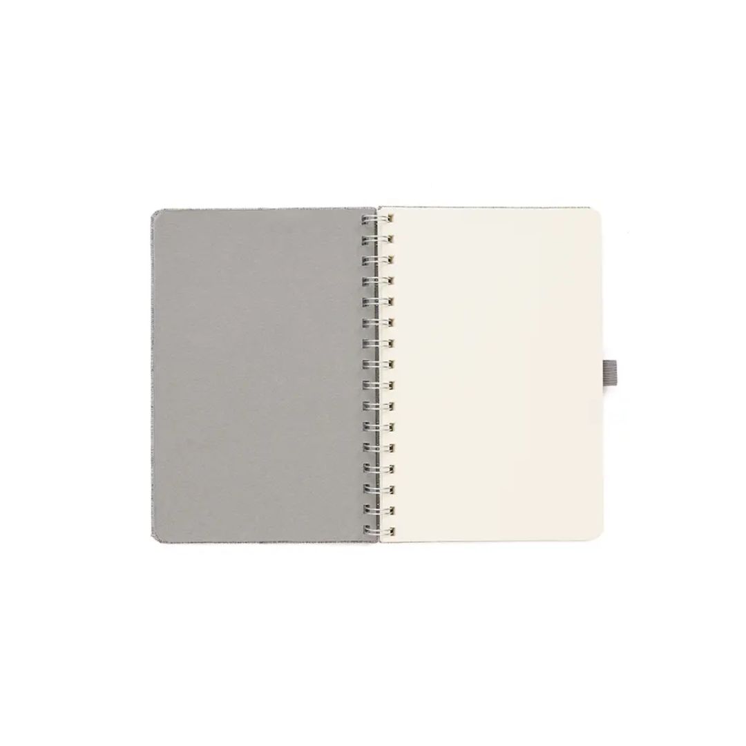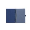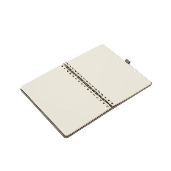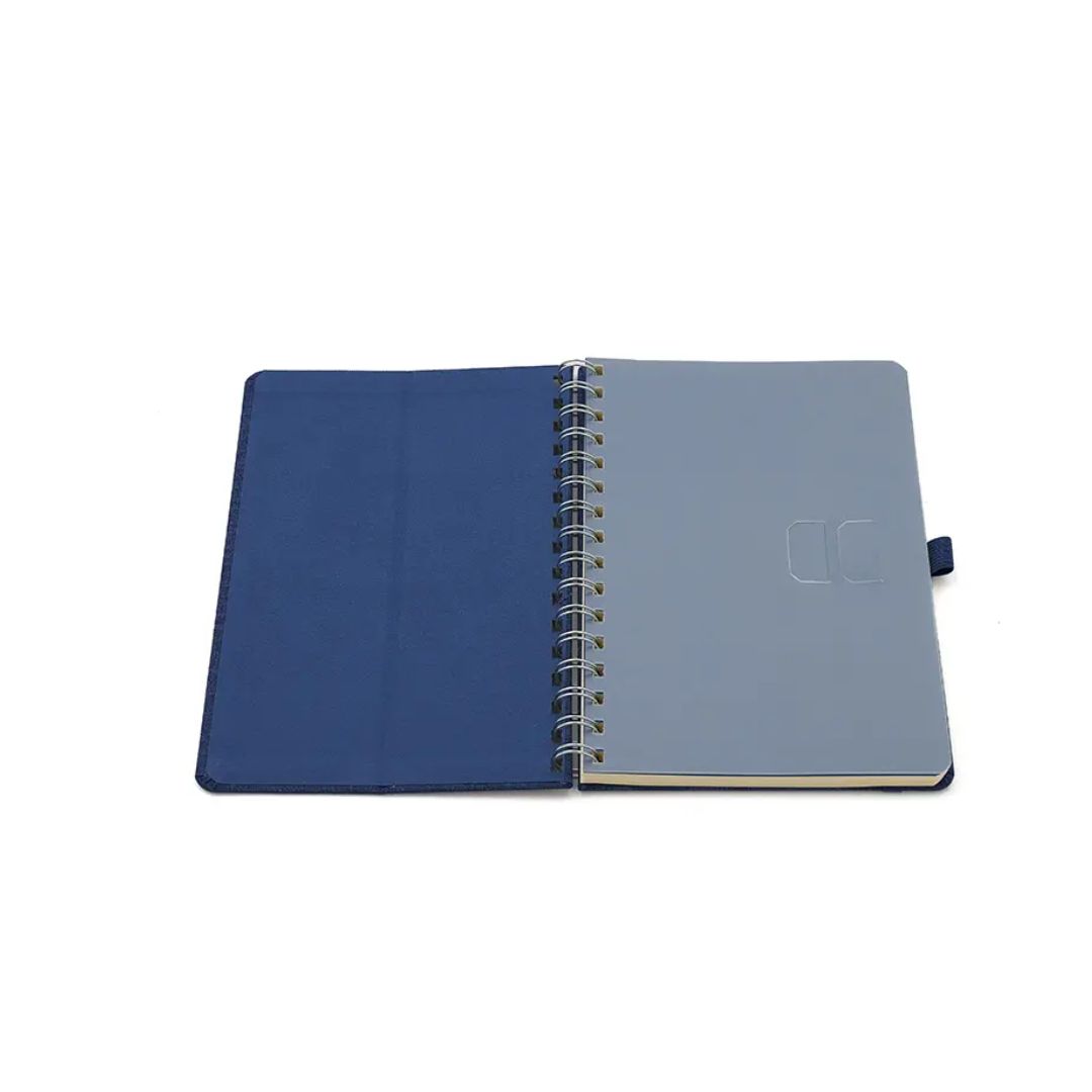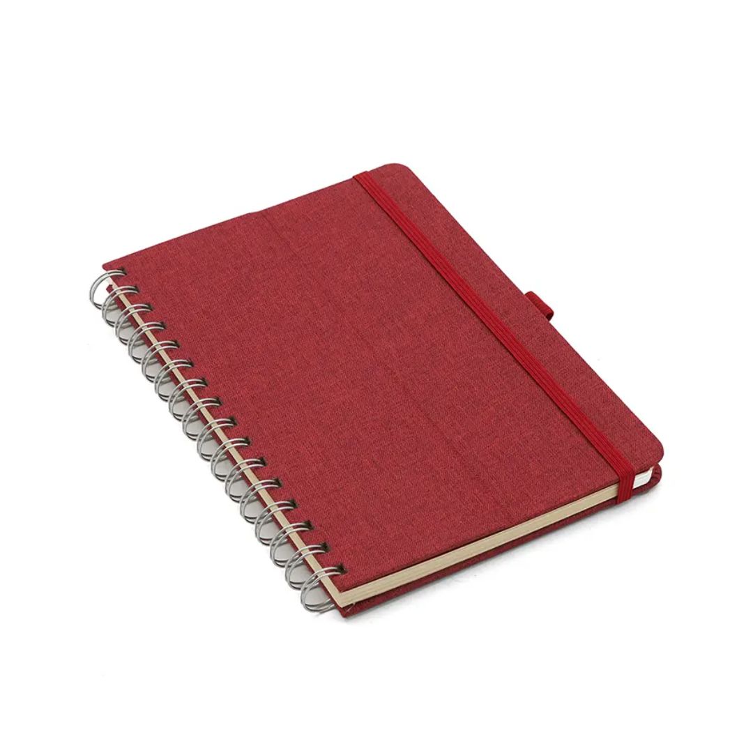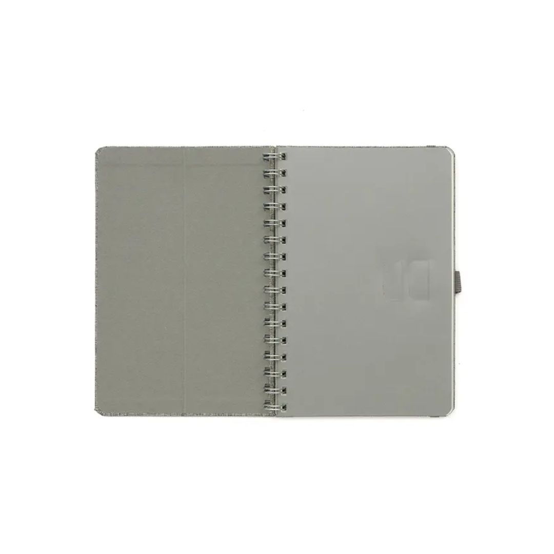 Descripción general del producto: Cuaderno anillado de 80 hojas lisas de 70gr. Tapa dura confeccionada en RPET, material hecho con botellas de plástico recicladas. Su tapa delantera puede doblarse, creando un soporte para teléfono. Cuenta con cierre elástico y porta lapicera. Colores disponibles: gris, rojo y azul. Medidas: 21 x 15 cm (Altura x Ancho). The Daily Book.