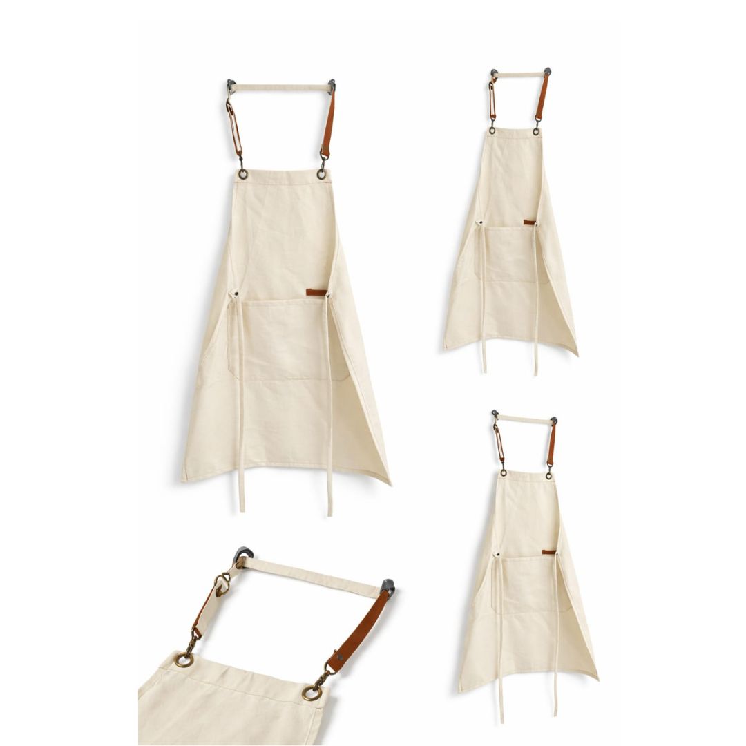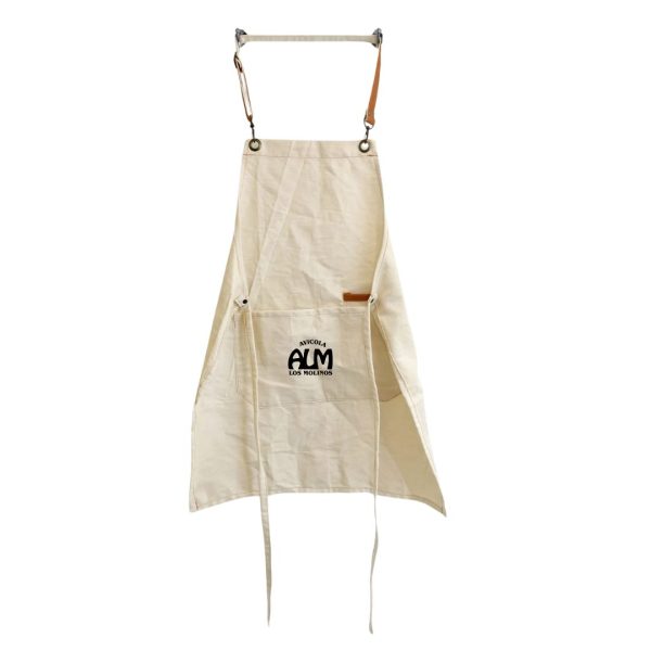 Descripción del producto: Delantal fabricado en gabardina cruda con bolsillo delantero central, detalles en PU color suela. Cuello regulable con herrajes de bronce.