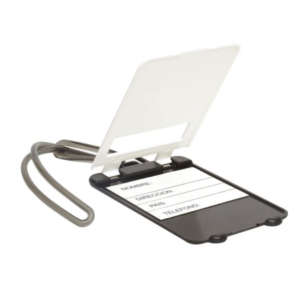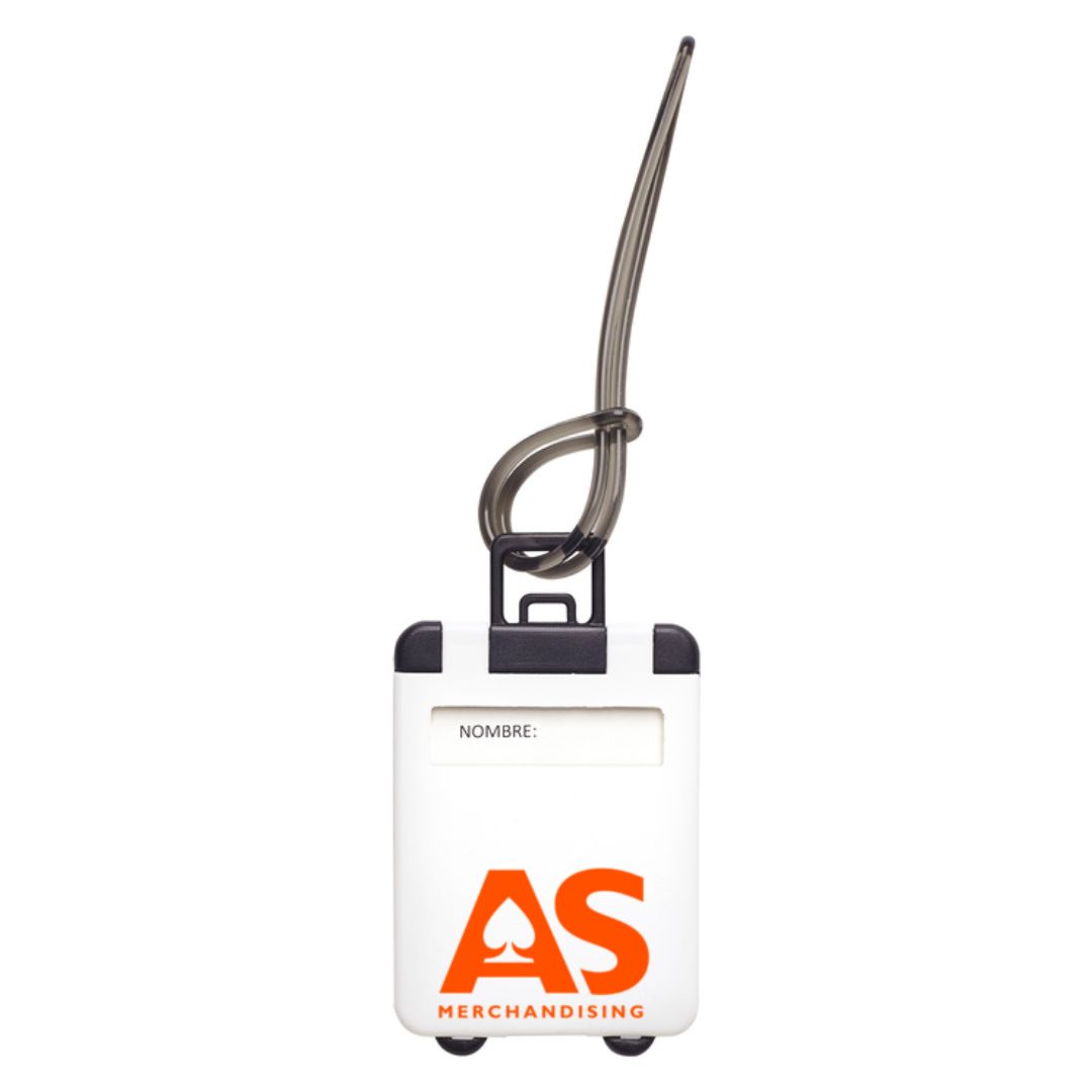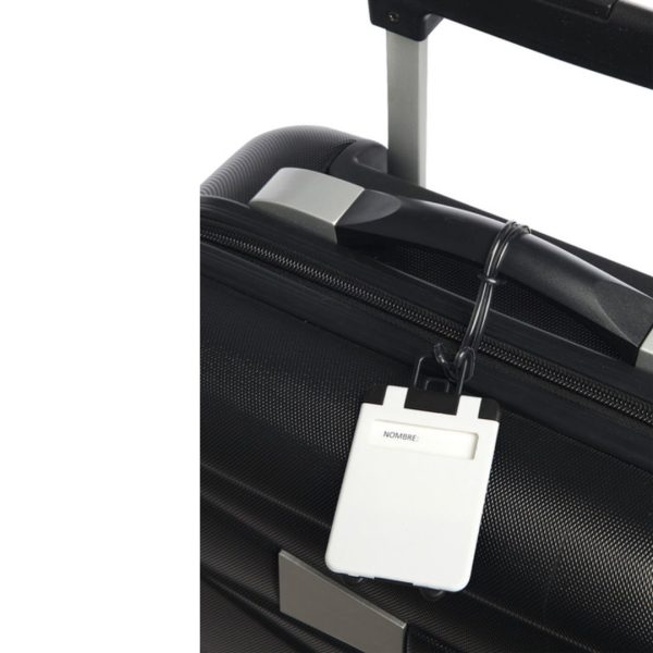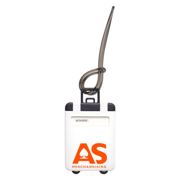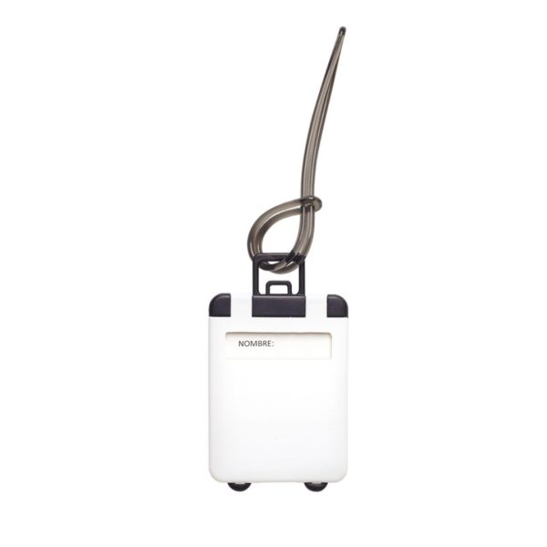 5,4 x 9 cm. Plástico. Identificador en forma de valija / maleta. Cuenta con etiqueta para datos personales. Lazo de plástico para colgar en la manija del equipaje.