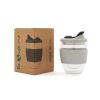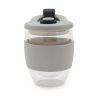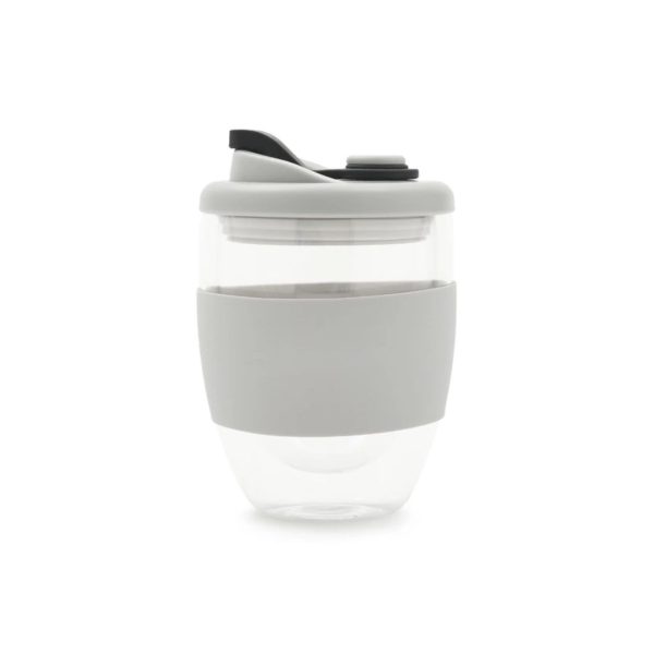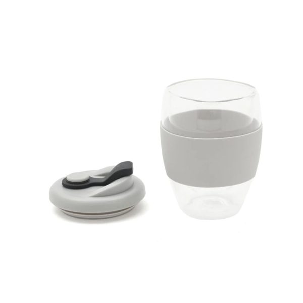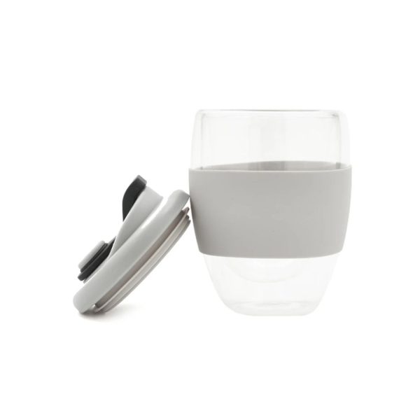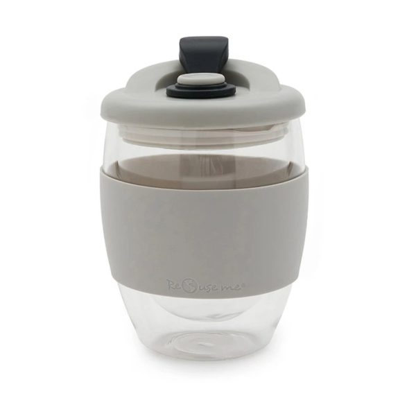 Descripción general del producto: Jarro reutilizable confeccionado en doble pared de vidrio de borosilicato, asegurando que el calor de la bebida no se transmita a las manos. Su tapa con pico y cierre a presión garantiza un uso práctico. Cuenta con una banda de silicona gris antideslizante personalizable. Con una capacidad de 350 ml, es ideal para disfrutar de tus bebidas favoritas en cualquier momento del día. Es apto para lavavajillas. Es apto para microondas. ReUseMe. Incluye Gift Box confeccionada en cartulina Kraft.
