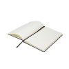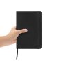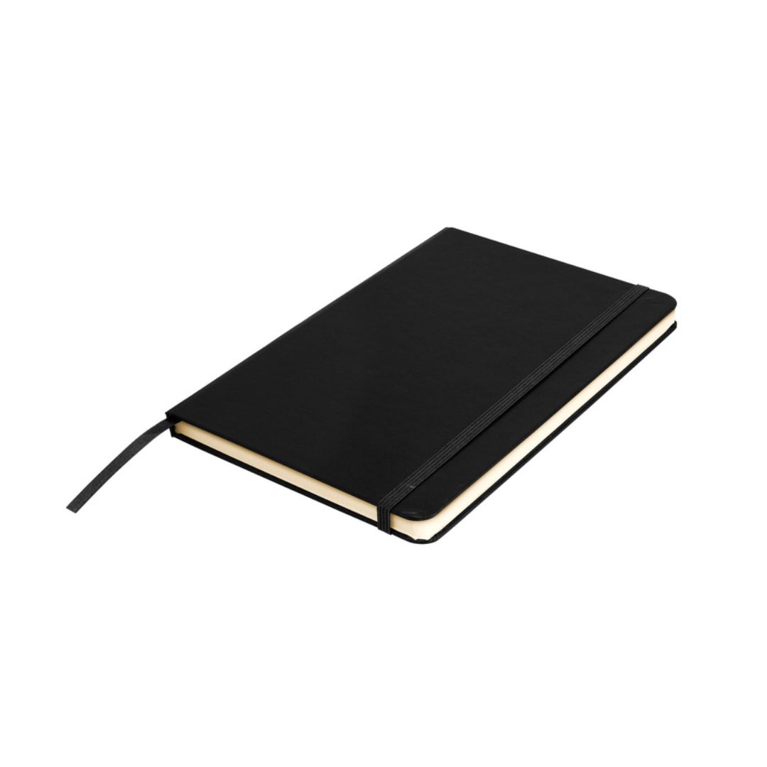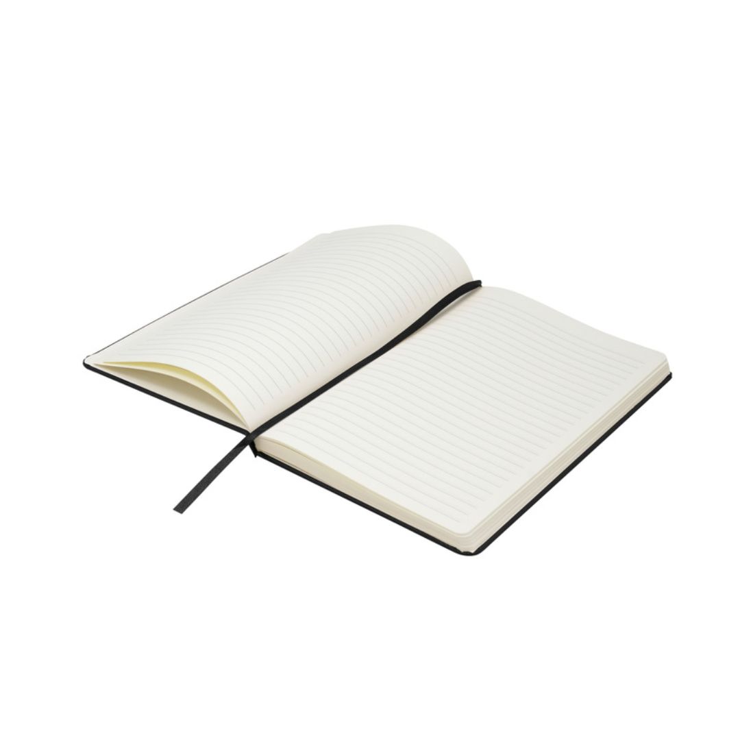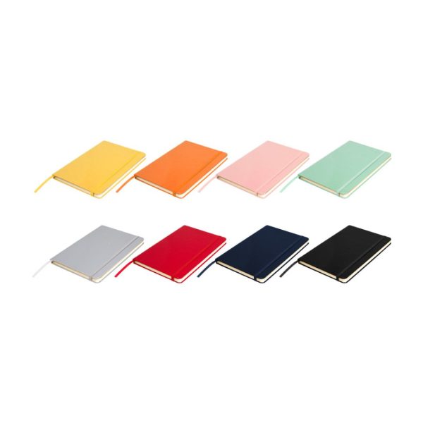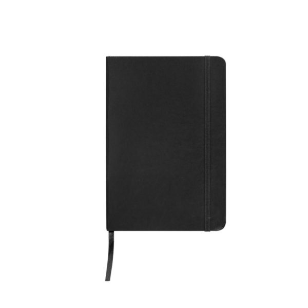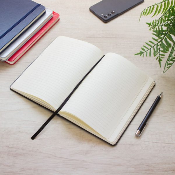 Descripción del producto: Libreta. Tapa de cartón de 300g recubierta en poliuretano de diferentes colores. Interior de 80 hojas rayadas en papel obra crema de 70g. Encuadernación cosida. Incluye cinta señaladora del color de la tapa. Cierre con banda elástica del mismo color., Medidas: 14 x 21 x 1,5 cm. Materiales: Papel, Cartón, Poliuretano.