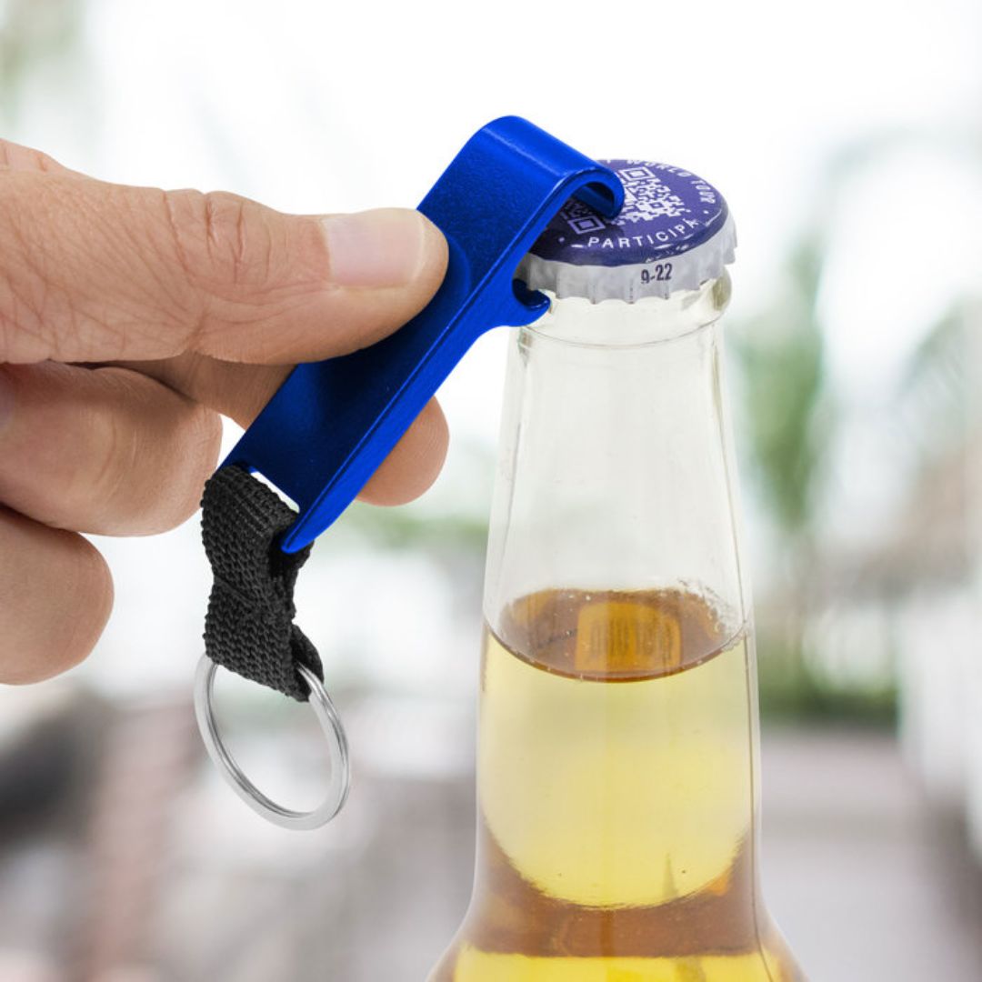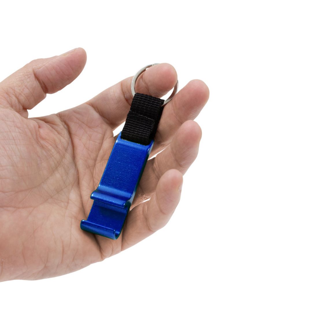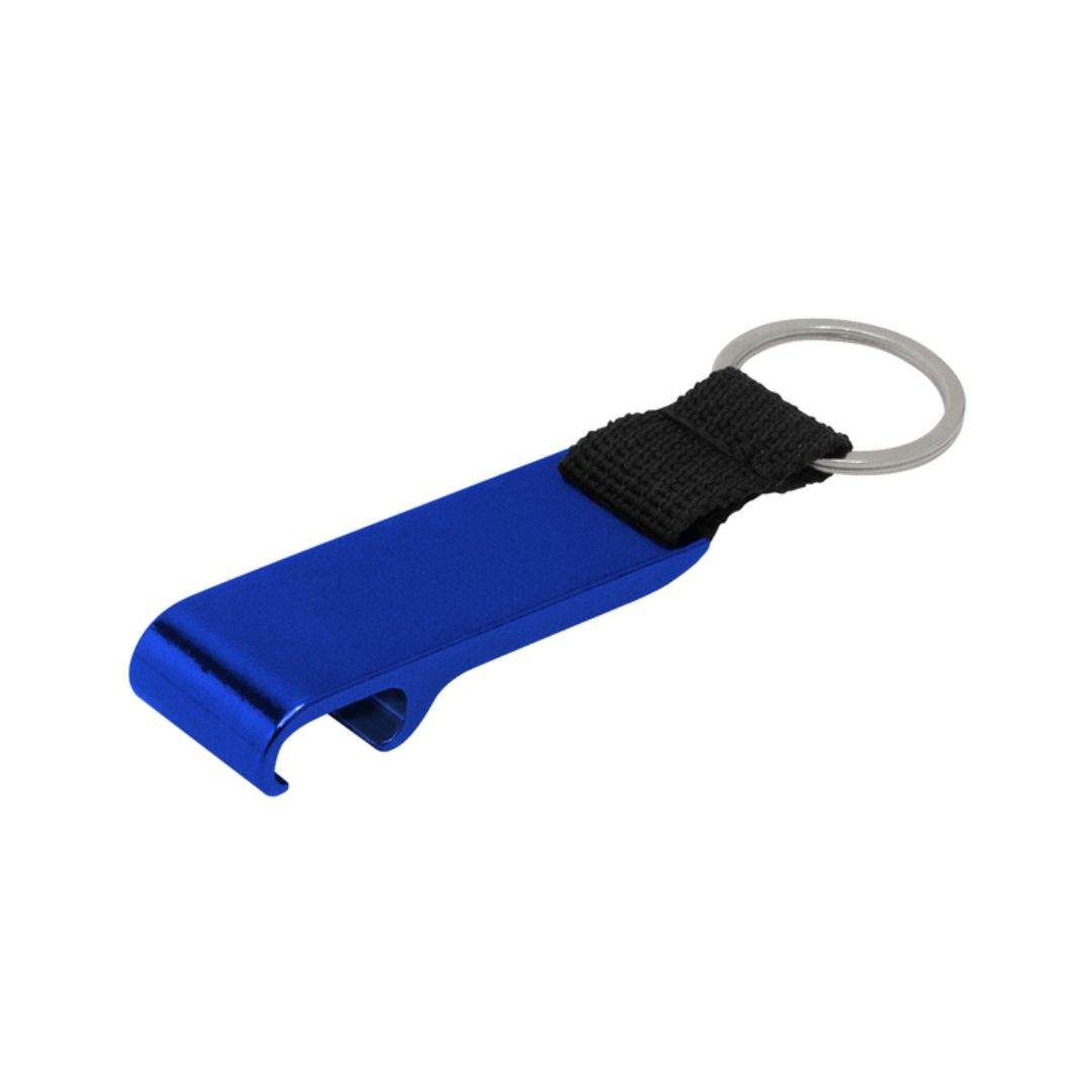 Descripción general del producto: Llavero destapador con correa de poliester color negro de 2.5 x 1.5cm. Pintura acabado brillante. Medidas: 9,5 x 1,9 cm. Materiales: Aluminio y Poliéster.