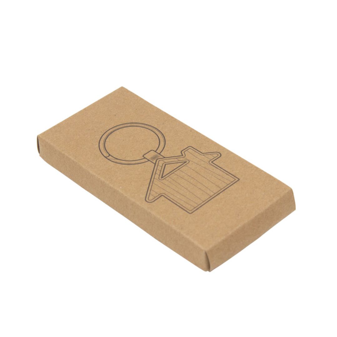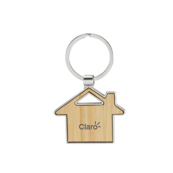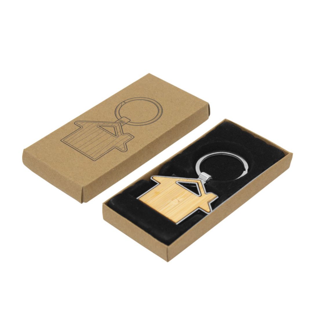 Descripción general del producto: Llavero con forma de casa. Estructura metálica con aleación de zinc con acabado brillante y panel frontal de bambú barnizado. Medidas: 7,5 x 4,8 x 0,7 cm. Materiales: Hierro y Bambú. Presentación: en caja de regalo kraft con bandeja de terciopelo color negro.