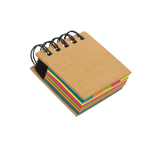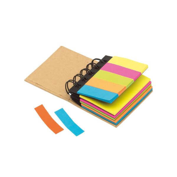 Descripción general del producto: 7,5 x 2 x 7 cm Cartón. Material reciclado. 5 blocs de 25 notas adhesivas rectangulares grandes. 5 blocs de 25 notas adhesivas rectangulares chicas estilo banderitas. Anillado metálico.