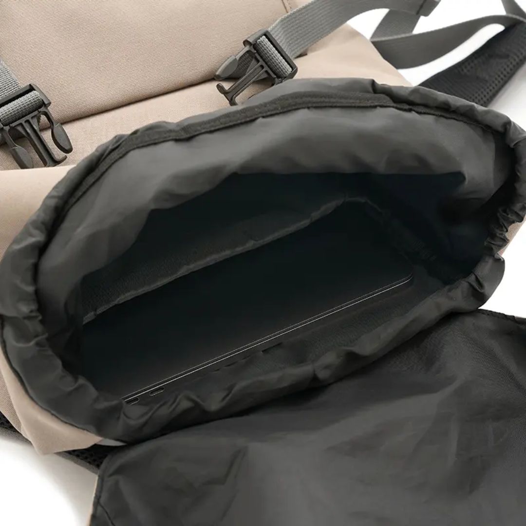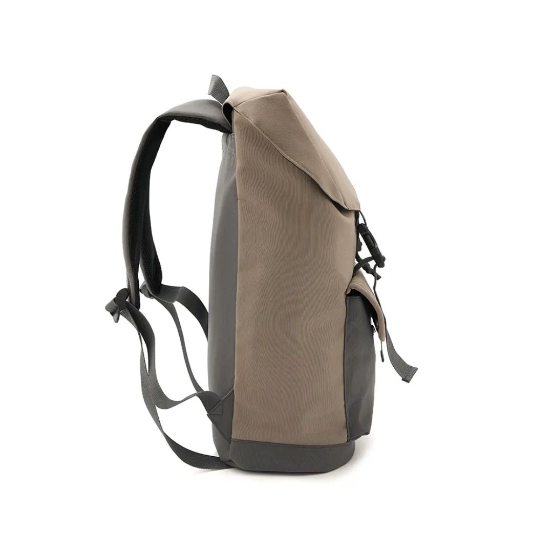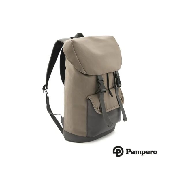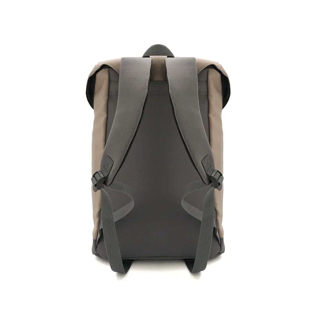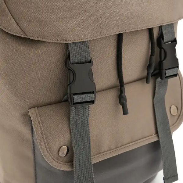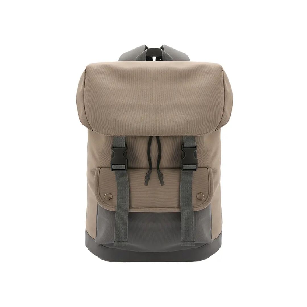 Descripción general del producto: Mochila compacta con solapa y doble broche frontal. Está confeccionada en polycotton laminado 600D. Cuenta con cierre interior, bolsillo frontal y correas acolchadas ajustables. Incluye tirador superior, base reforzada y espalda acolchada.