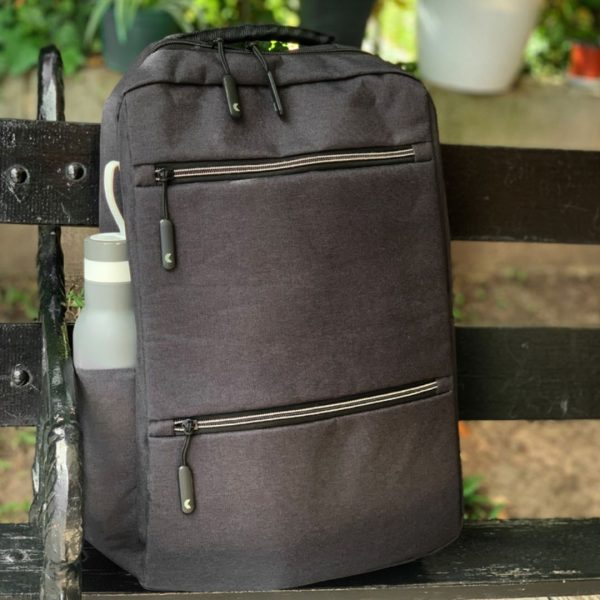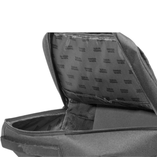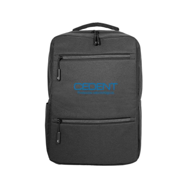 28 x 41 x 11 cm. Capacidad 12 litros. Poliester 300D Wulong, Mochila portanotebook de hasta 16 pulgadas. Compartimento principal con bolsillo porta notebook de hasta 16” y bolsillos para accesorios. Dos amplios bolsillos frontales con cierre y bolsillo lateral portabotellas. Tiradores de cierres engomados. Correas regulables y espalda acolchadas. Presencia de marca en el interior y en una de sus correas.