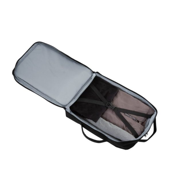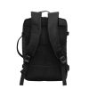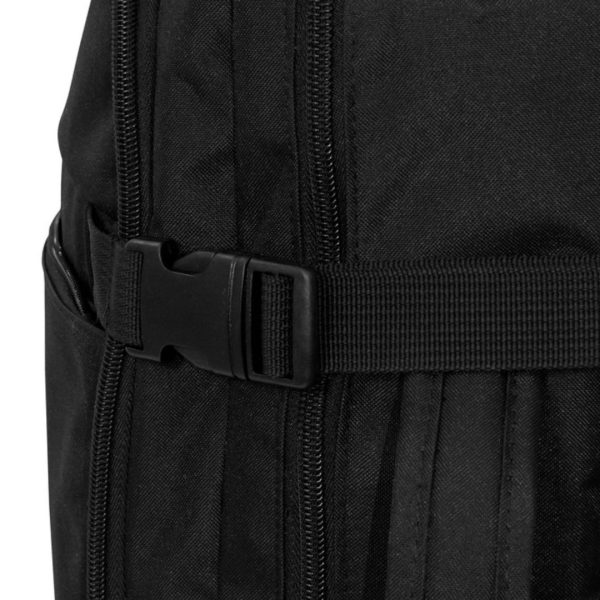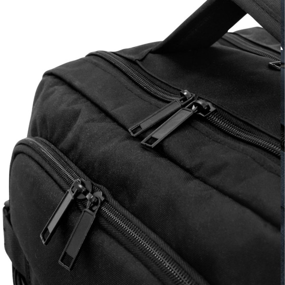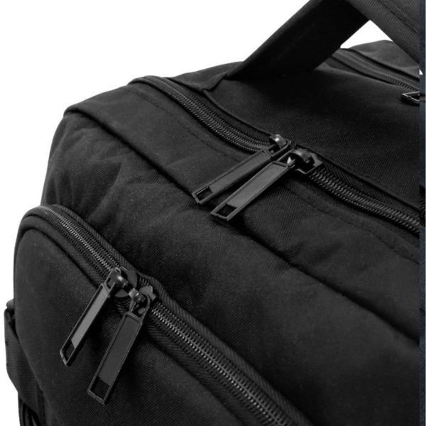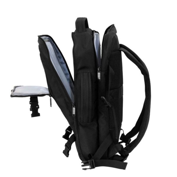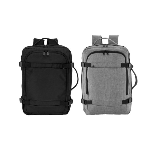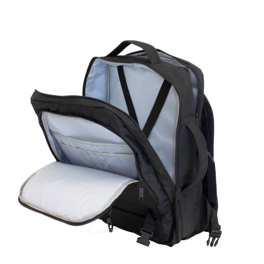 Mochila carry on con 4 compartimentos acolchados. Compartimento principal central con cierre de apertura 360° y elástico con hebilla para contener la ropa en un viaje de trabajo. Compartimento posterior con cierre y portanotebook de hasta 17 pulgadas. Compartimento frontal, exterior con cierre horizontal e interior con bolsillos organizadores. Dos asas, vertical y horizontal para un mejor traslado.  4 correas de hebillas ajustables al volúmen que se traslade. Espalda acolchada con red que permite ventilación. Tira para sujetar la mochila en la manija extensible de un equipaje de mano. Correas acolchadas. Tiradores de cierre plásticos.
