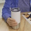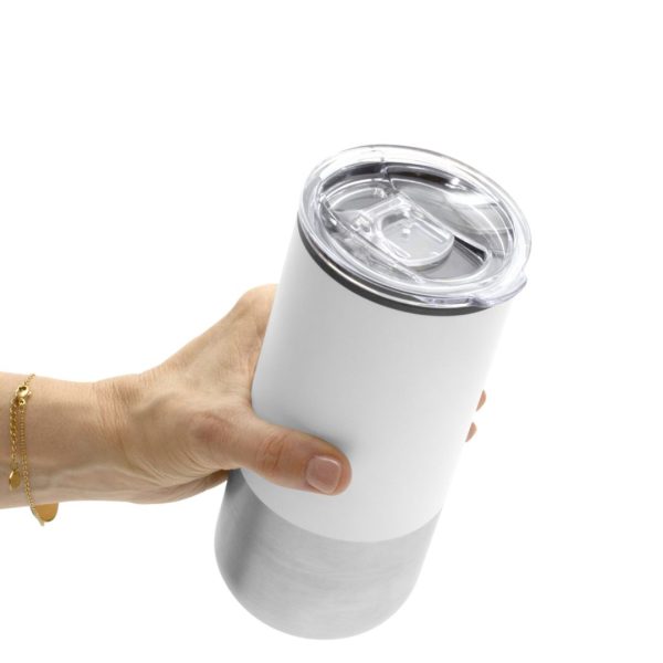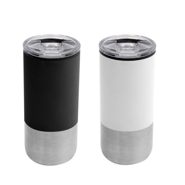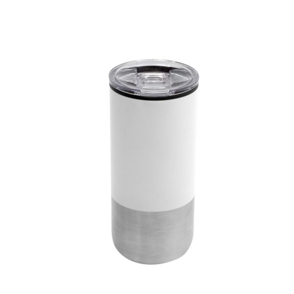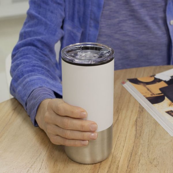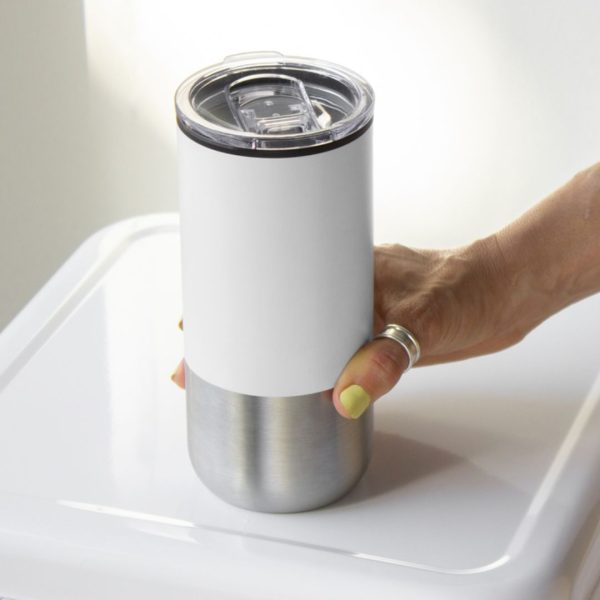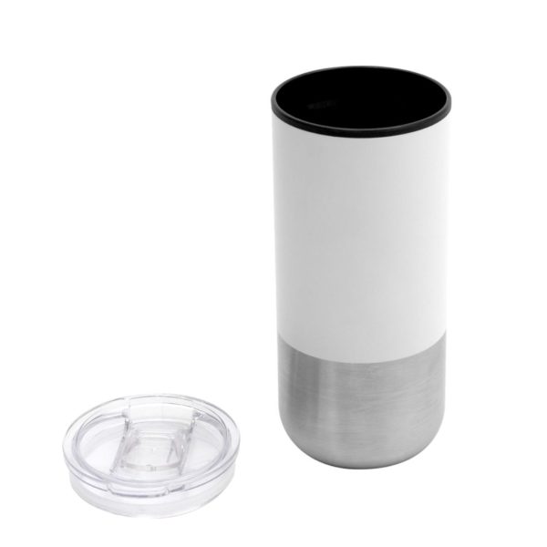 Descripción del producto: 8 cm X 17.6 cm. Capacidad 500 ml. Polipropileno y acero inoxidable. Mug doble pared. Interior en plástico y exterior de acero inoxidable 201. Tapa plástica transparente a presión con anillo de silicona. Base antideslizante. Presentación en caja de regalo Kraft.