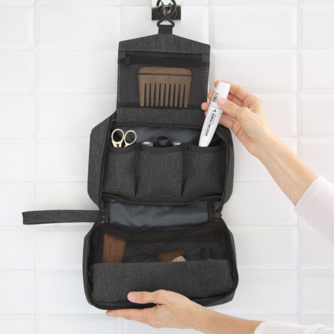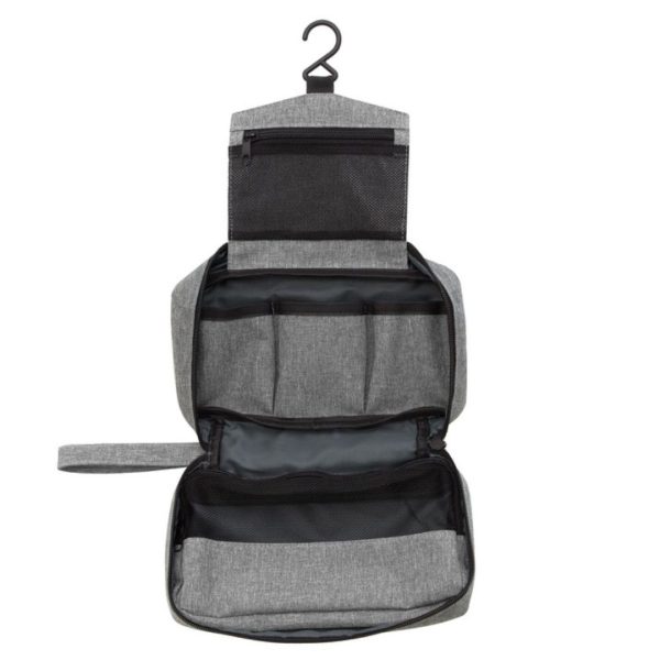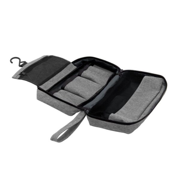 Necessaire colgante. Compartimento principal con cierre y asa de tela para transportar. Interior: compartimento superior rebatible con gancho para colgar y bolsillo de red con cierre, compartimento central con 3 bolsillos y amplio compartimento inferior con ventana de red y cierre.