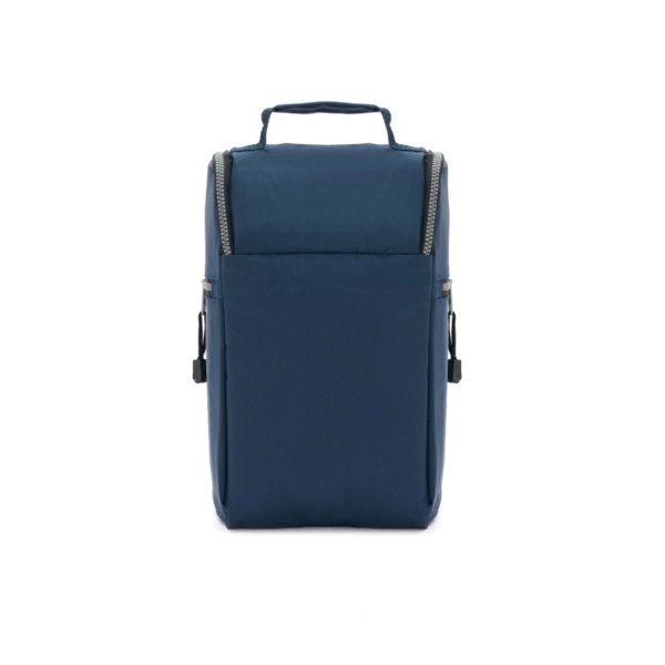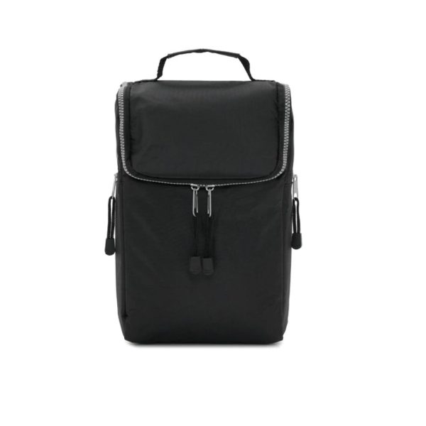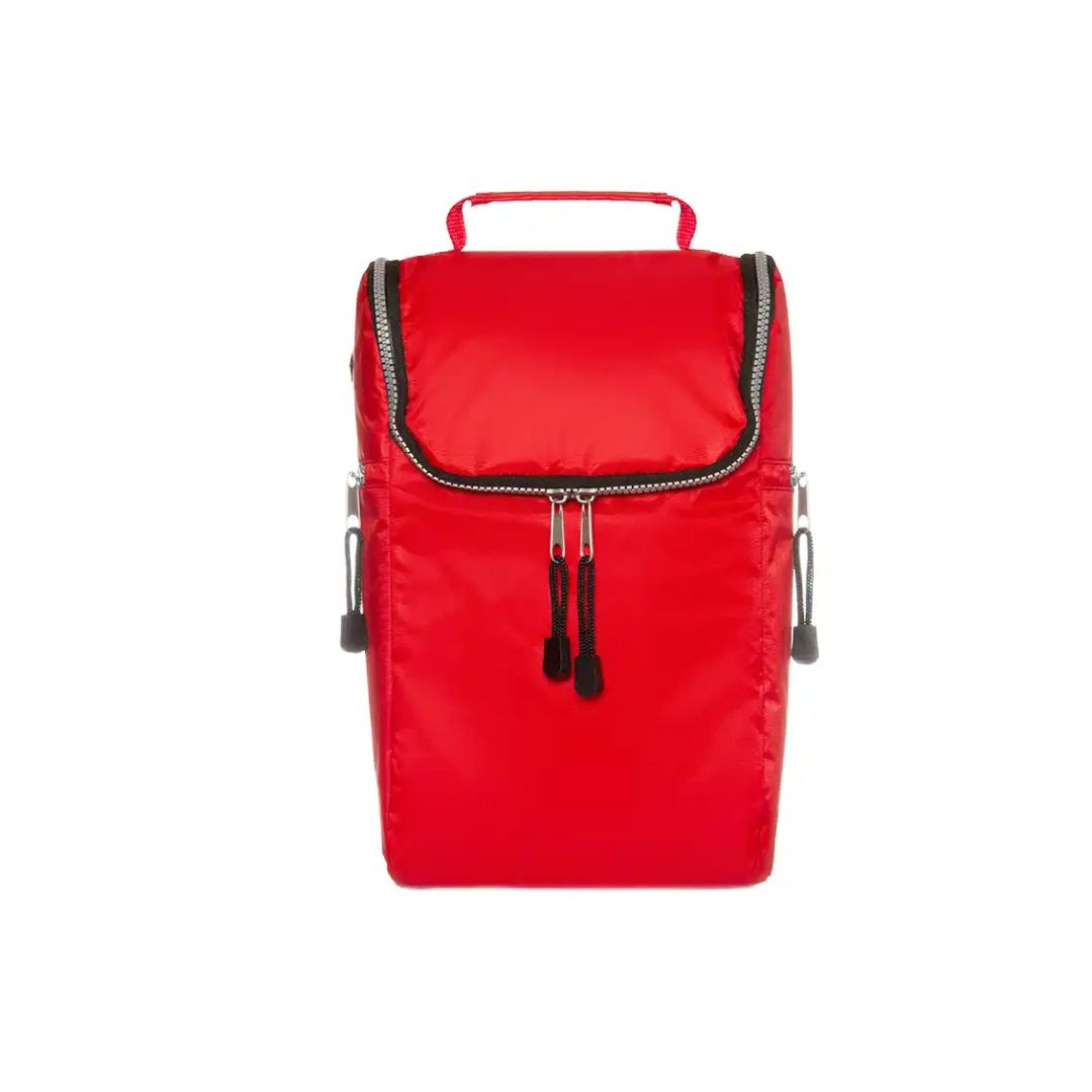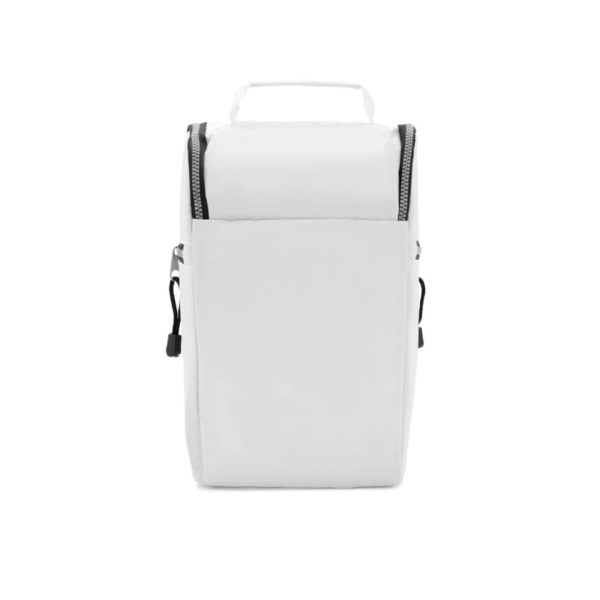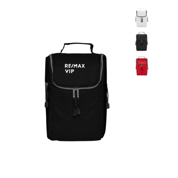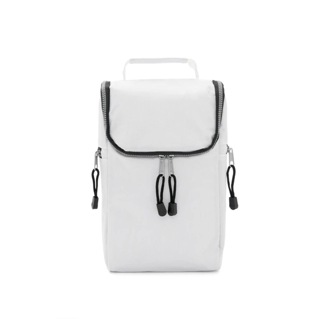 Descripción del producto: Cooler confeccionado en tela Nylon 600D, interior térmico forrado en PVC gris. Bolsillos laterales. Apto para llevar botellas, termos y otros. Colores: Negro, Blanco, Azul y Rojo. Medidas: 28 alto x 20 ancho x 14 base cm. Capacidad: 8 Lts. Tahg.