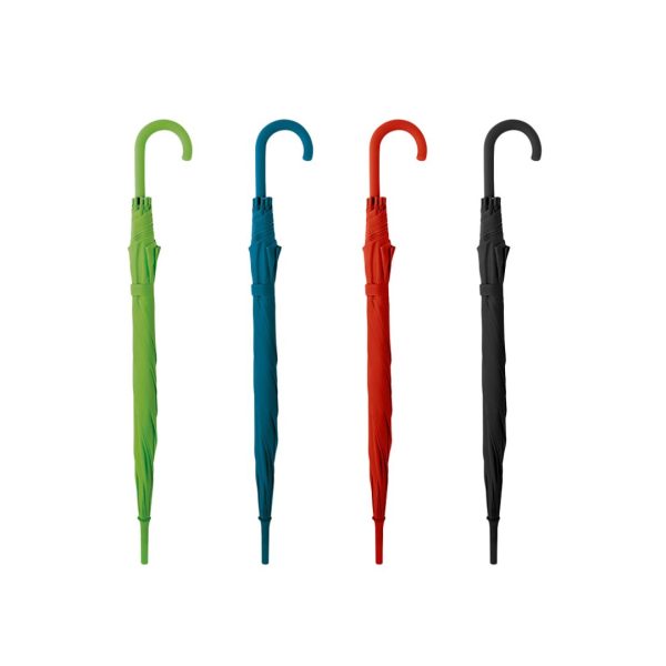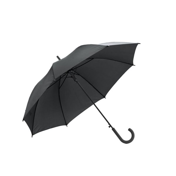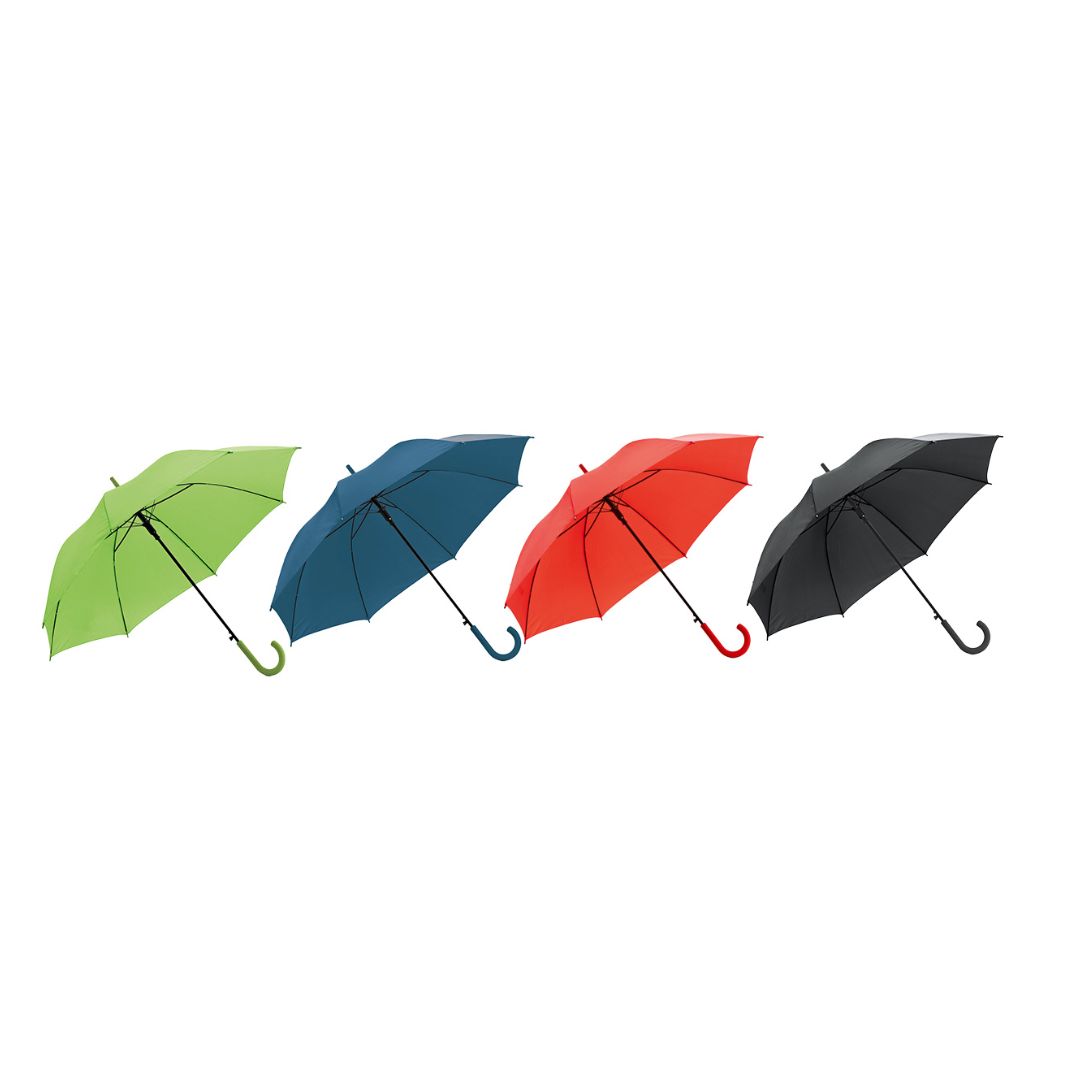 Paraguas de 8 gajos con mango curvo de goma y estructura metálica. Con mecanismo de apertura automática. Material: Poliéster 190T. Diámetro 104 cm, Largo 83 cm Polybag