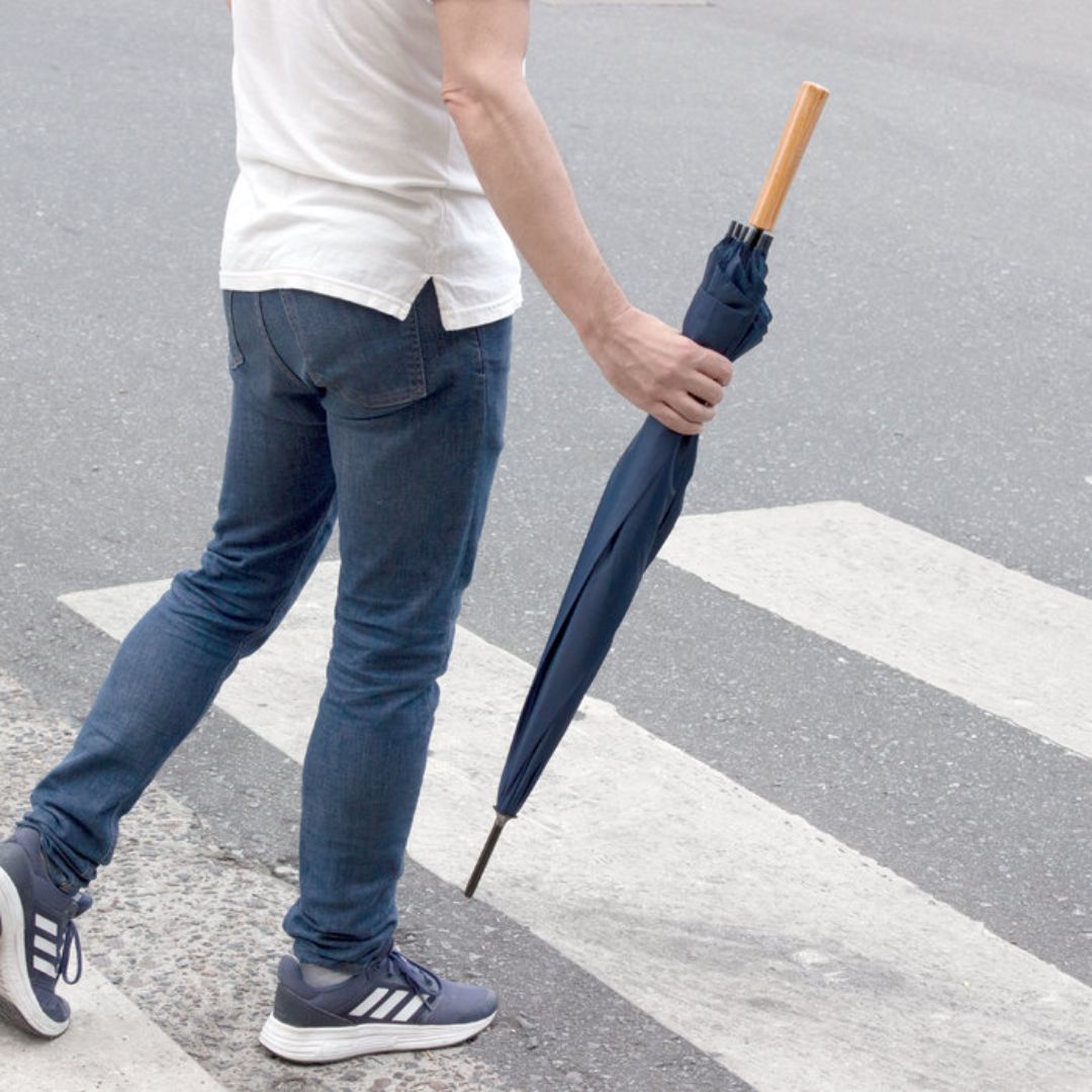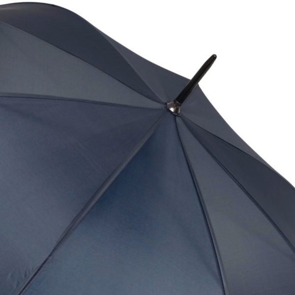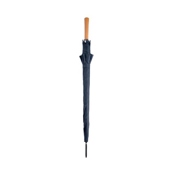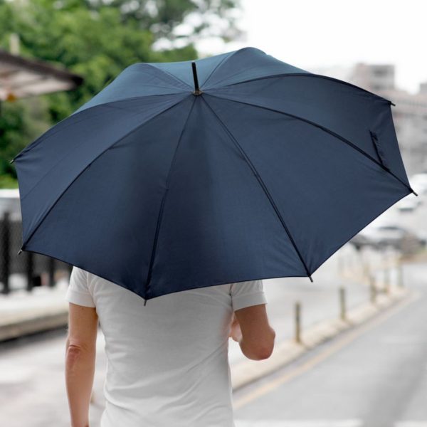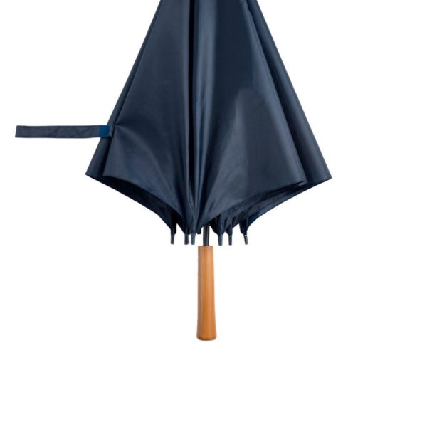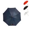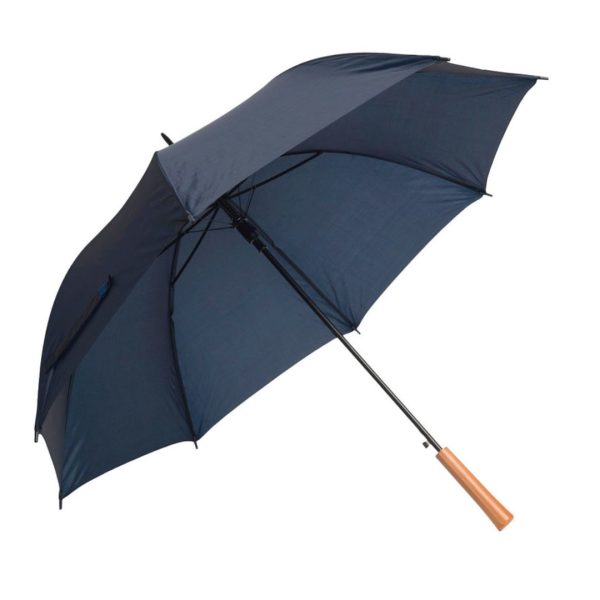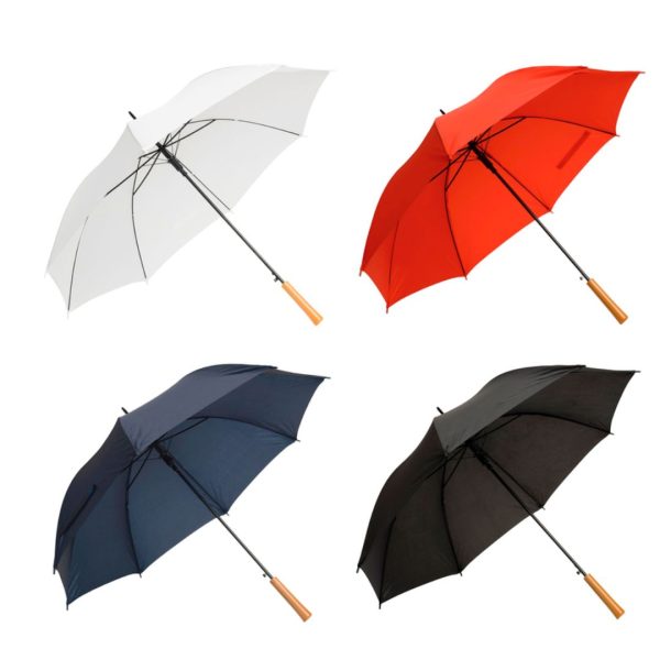 100 cm. 8 gajos. Ancho gajo 40 cm. Largo total 84 cm. Poliéster, metal y PVC. Paraguas APERTURA AUTOMÁTICA Y CIERRE MANUAL. Eje, varillas y punta metálicas y mango en PVC, símil madera. Botón a presión. Cierre con correa de velcro.
