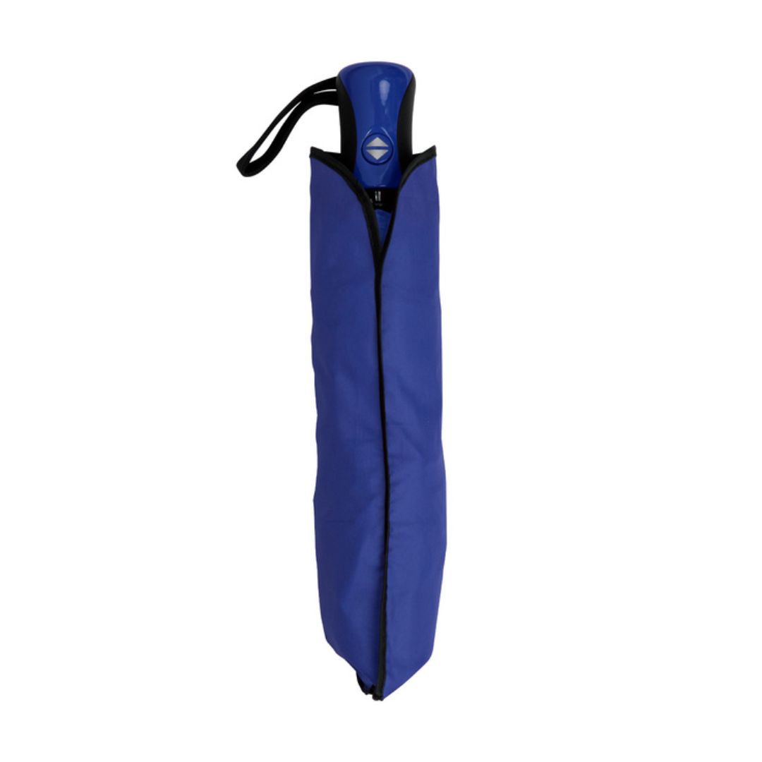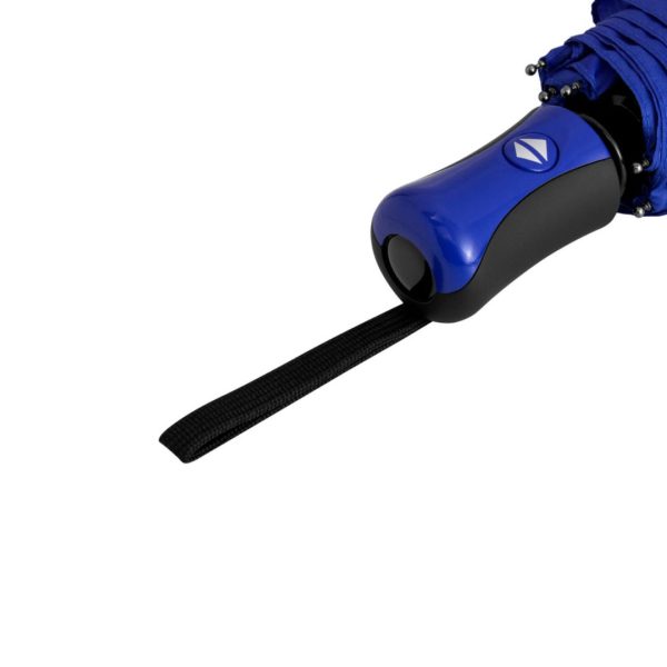 Paraguas APERTURA Y CIERRE AUTOMATICO. Eje metálico de color negro y varillas de fibra. Mango de plástico engomado con revestimiento de poliuretano color negro y detalles en color a tono con la tela, acabado brillante. Correa cordón color negro. Botón a presión. Tela con detalles en color negro. Cierre con correa de velcro.