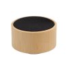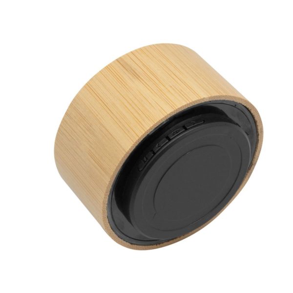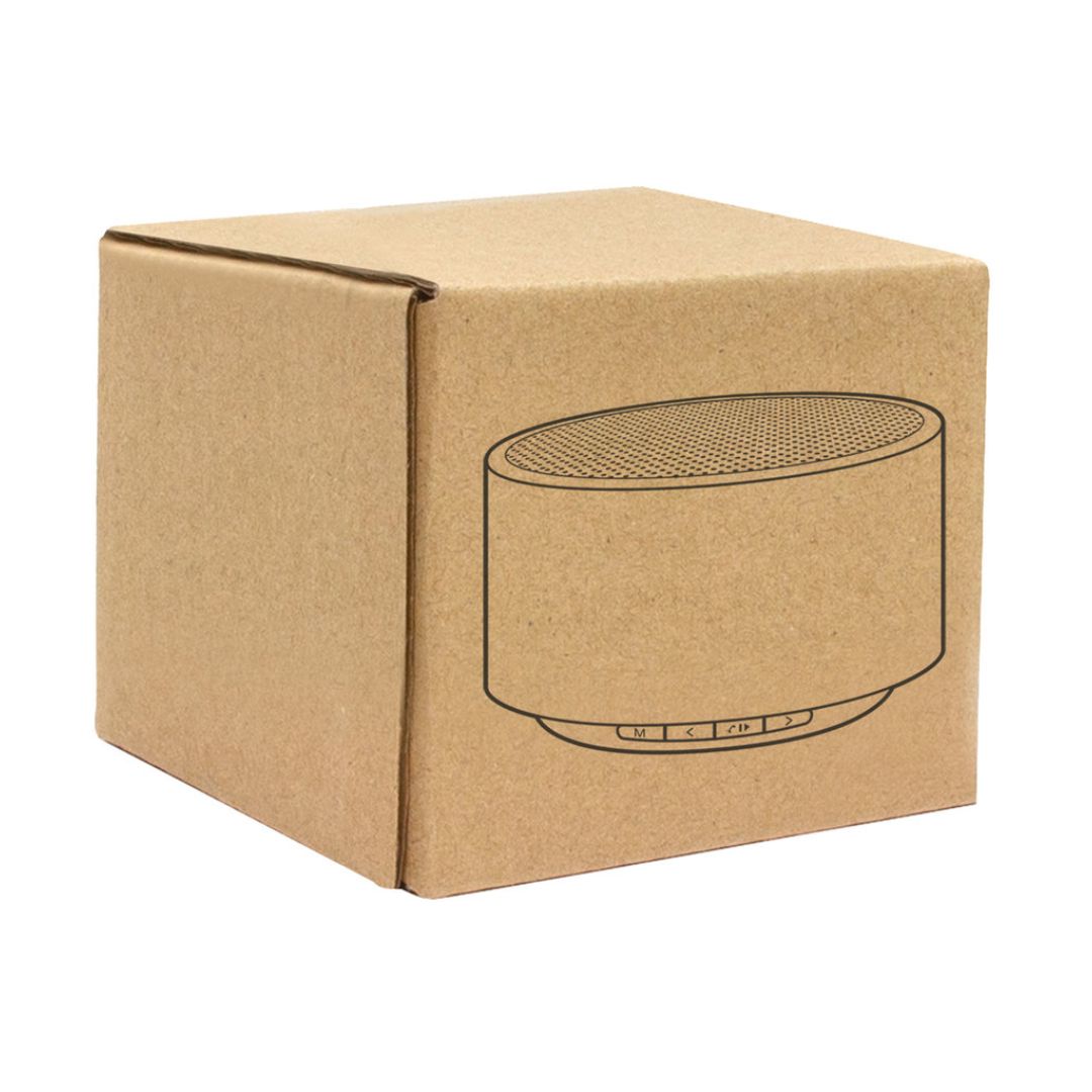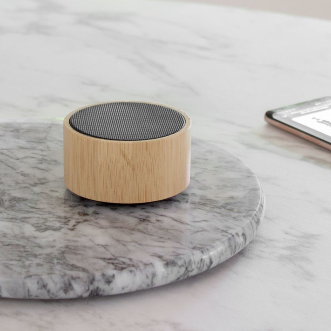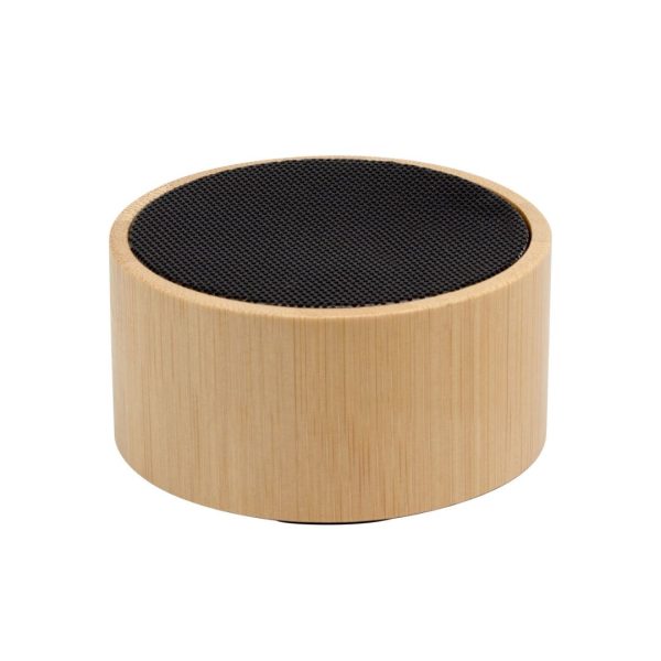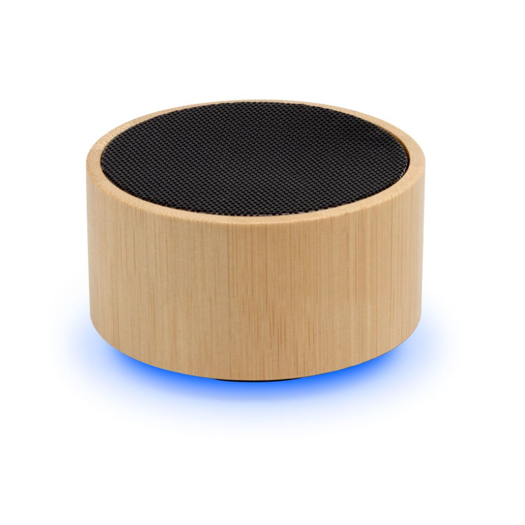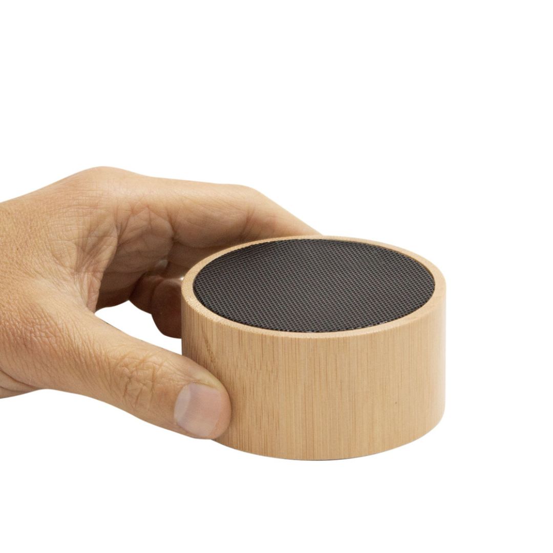 Descripción del producto: 7,5 x 4 cm. Parlante Bluetooth. Caja redonda de Bambú color natural con malla metálica en la parte superior. Base negra con panel de control. Permite recibir llamadas. Micrófono incorporado. Versión bluetooth: 5.0. Batería: 300 mAh. Potencia: 3W. Cable de carga y conexión USB tipo C en color negro. Presentación en caja de regalo Kraft.