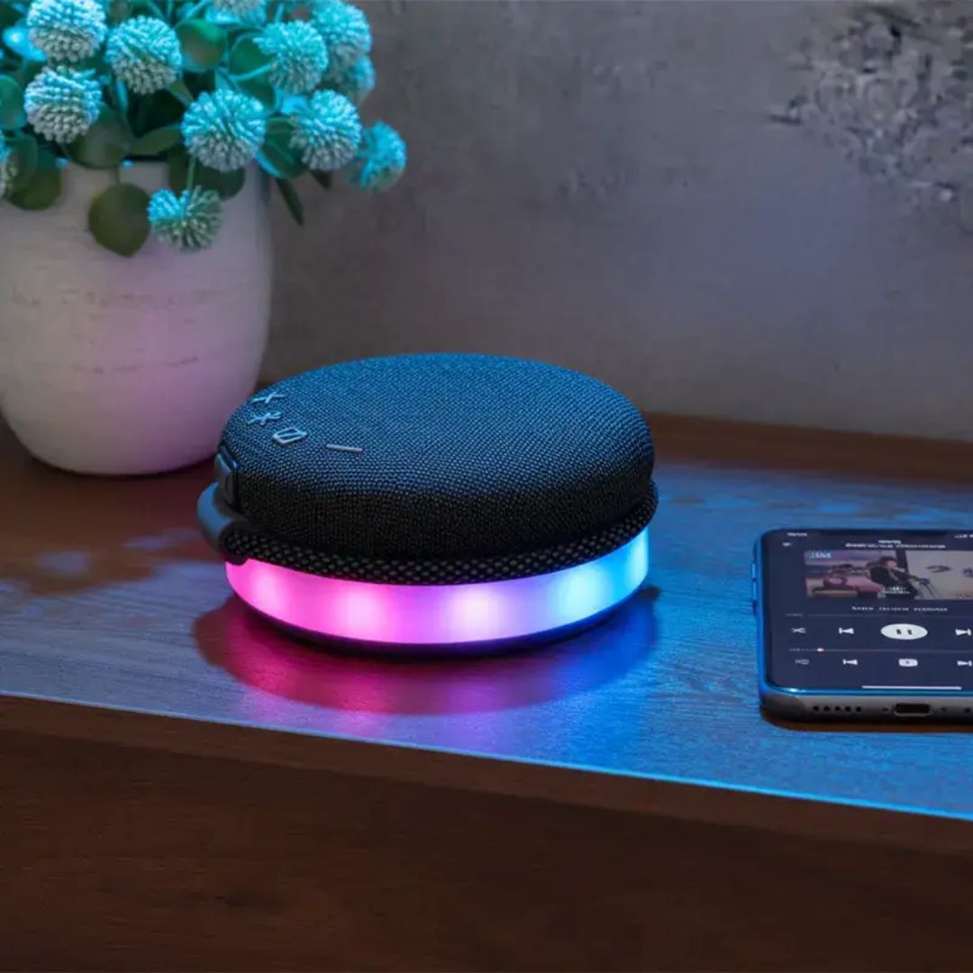 Descripción general del producto: El parlante Fullmoon cuenta con luces led multicolor y una correa ajustable para que lo lleves a donde quieras. Está fabricado en ABS y silicona, con un recubrimiento de tela. Su capacidad es de 1800 mAh, ideal para acompañarte en tu día a día y disfrutar de tu música en cualquier ocasión. Kingtech.